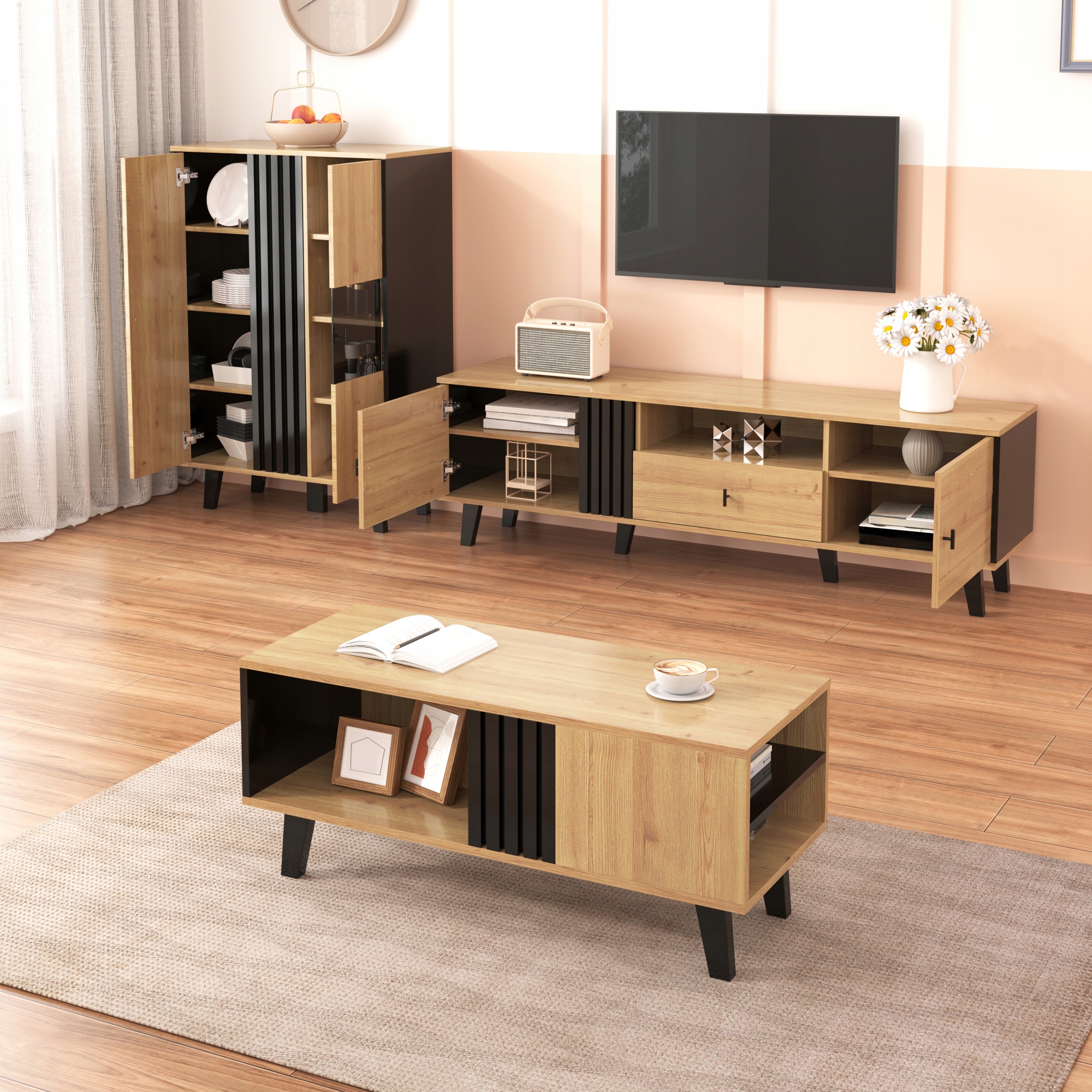 боковые шкафы, боковые доски, очки со стеклом и светодиодным освещением. Содержит ламинаты, комбинацию черных и деревянных цветов, уникальный рисунок черных полос дерева