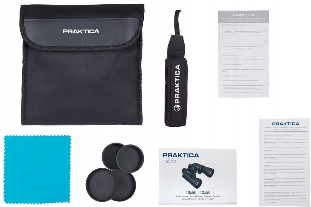 При покупке бинокля PRAKTICA Falcon 10x50 вы получаете базовое устройство, чехол, крышку объектива, крышку окуляра, чистящую ткань, ремешок и документацию.