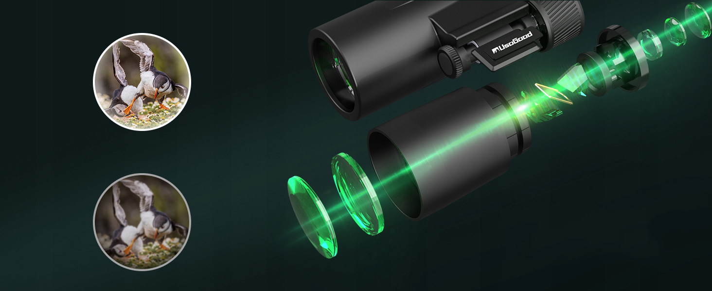 - Смотрите с биноклем Usogood с диаметром выходного зрачка 4,2 мм, вы увидите изображение настолько яркое, как если бы вы видели его невооруженным глазом.