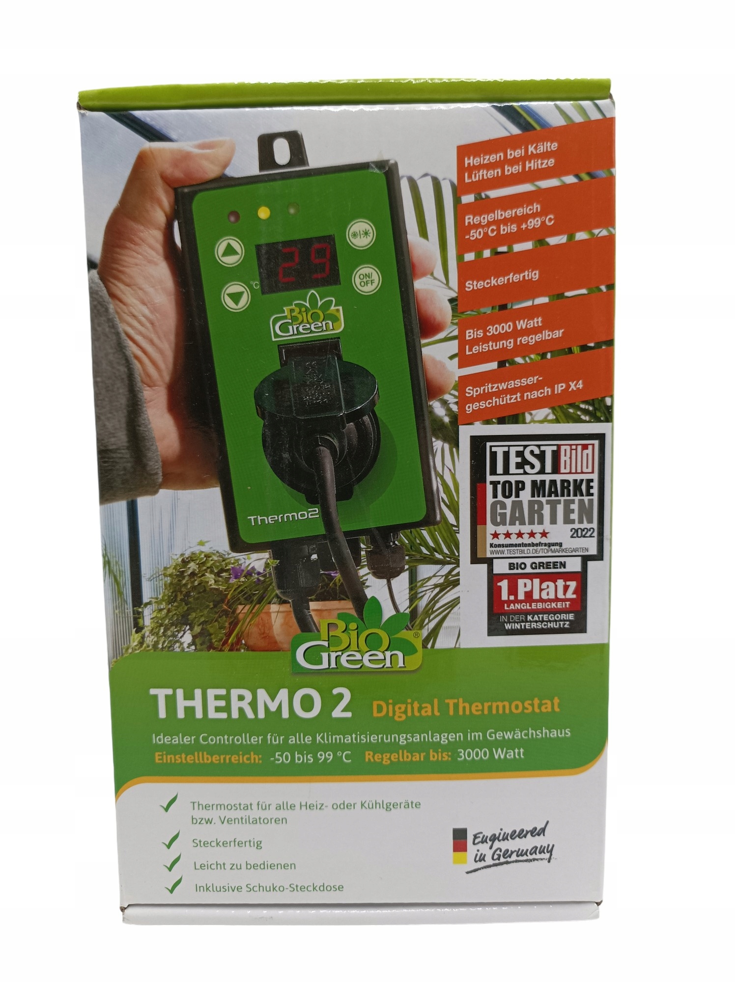 Термостат для отопления и климат-контроля мощностью до 3000 Вт (16 А, 230 В). Термостат Bio Green Thermo 2 — идеальный контроллер для всех потребностей в управлении климатом в теплице. Может использоваться как регулятор вентиляции летом и как регулятор отопления зимой.