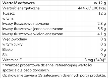 2 раза в день 2 чайные ложки масла 3 г (в общей сложности 12 г) соответствуют 24% рекомендуемая суточная потребность в жирах в виде ненасыщенных жирных кислот. Не превышайте дозу 50 г в день.