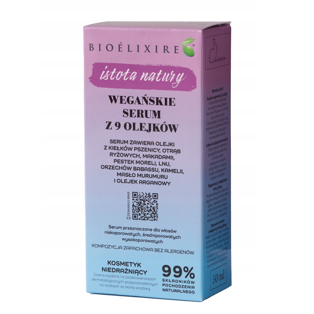 Bioelixire Vegan Serum, изготовленная из 9 масел из красоты Nature Series , предназначенная для ухода за волосами, средней и низкой пористости. Формула обогащена необычной композицией из 9 масел: от ростки пшеницы, рисовых отрубей, макадамии, абрикоса, льна, бабассу, масла Мурумур, камелии и арганового масла. Это улучшает состояние волос, уменьшая их хрупкость. Укрепляет волосы, интенсивно увлажняет и сглаживает. Это предотвращает разделенные концы. Масло окружает чешуйки для волос защитной пленкой, благодаря которой оно предотвращает потерю воды. Это естественная ультрафиолетовая защитная пленка против солнечной радиации.