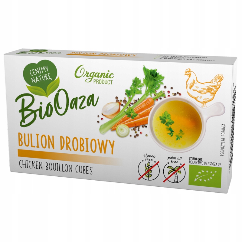 Бульон из птицы BioOaza - органический продукт, без пальмового масла, без глютена, с добавлением морской соли.