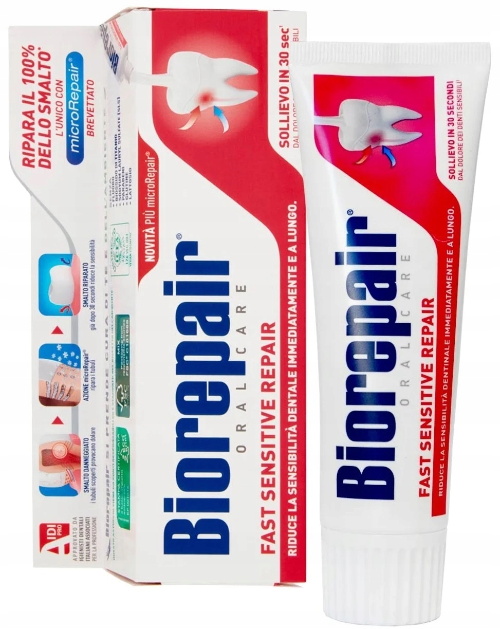 Biorepair Fast Sensitive Repair — зубная паста, предназначенная для повседневного использования, с высокой концентрацией частиц microRepair 240 мг/г, которые восстанавливают зубы. эмаль и снижает гиперчувствительность уже с первого применения.