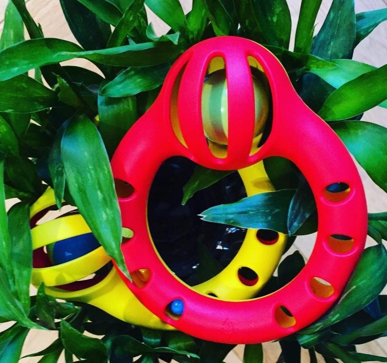 Это не просто погремушка. Давайте перевернем ее, и маленькие шарики спрячутся, создавая для глаз малыша интригующую игру в прятки.