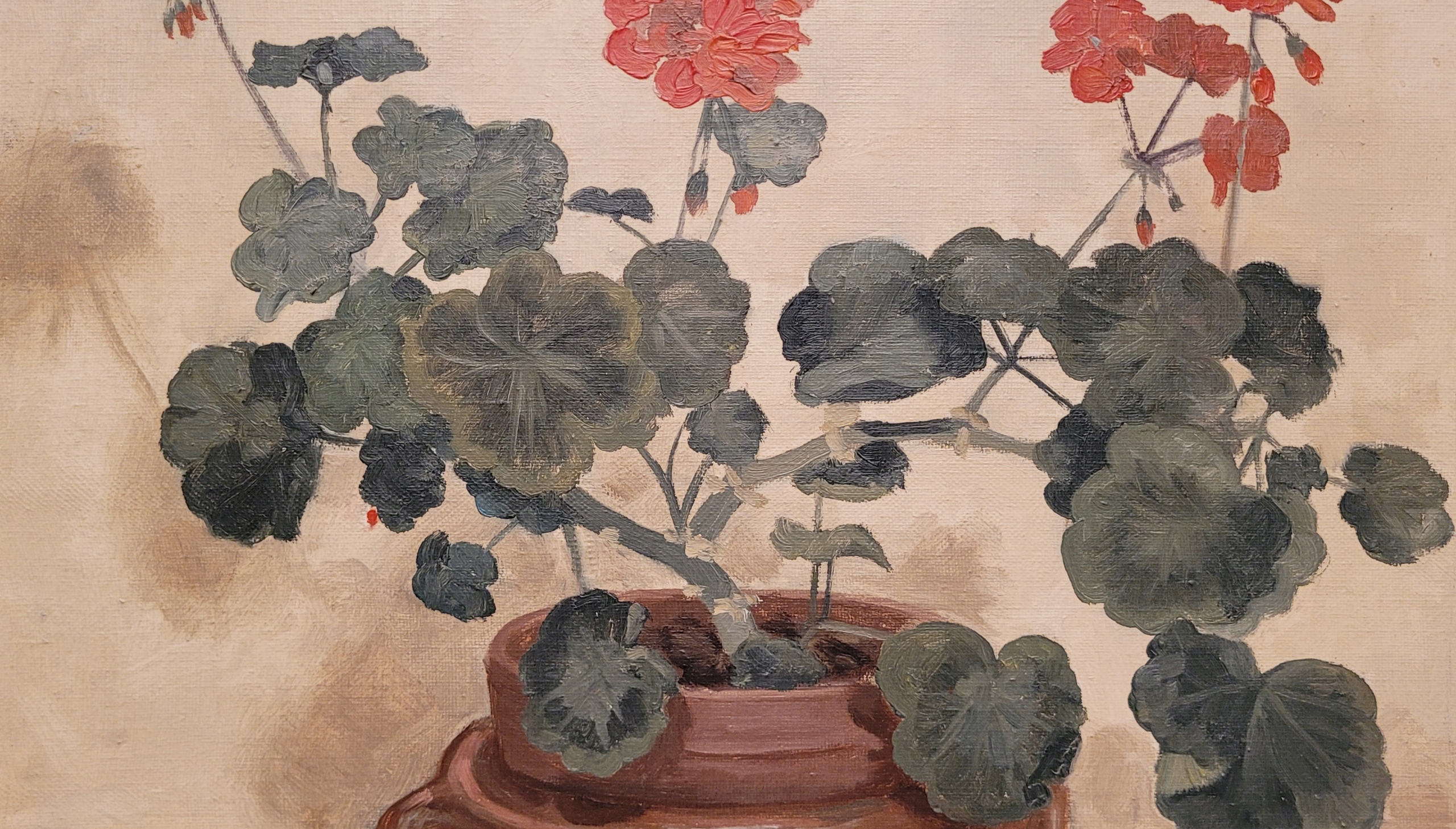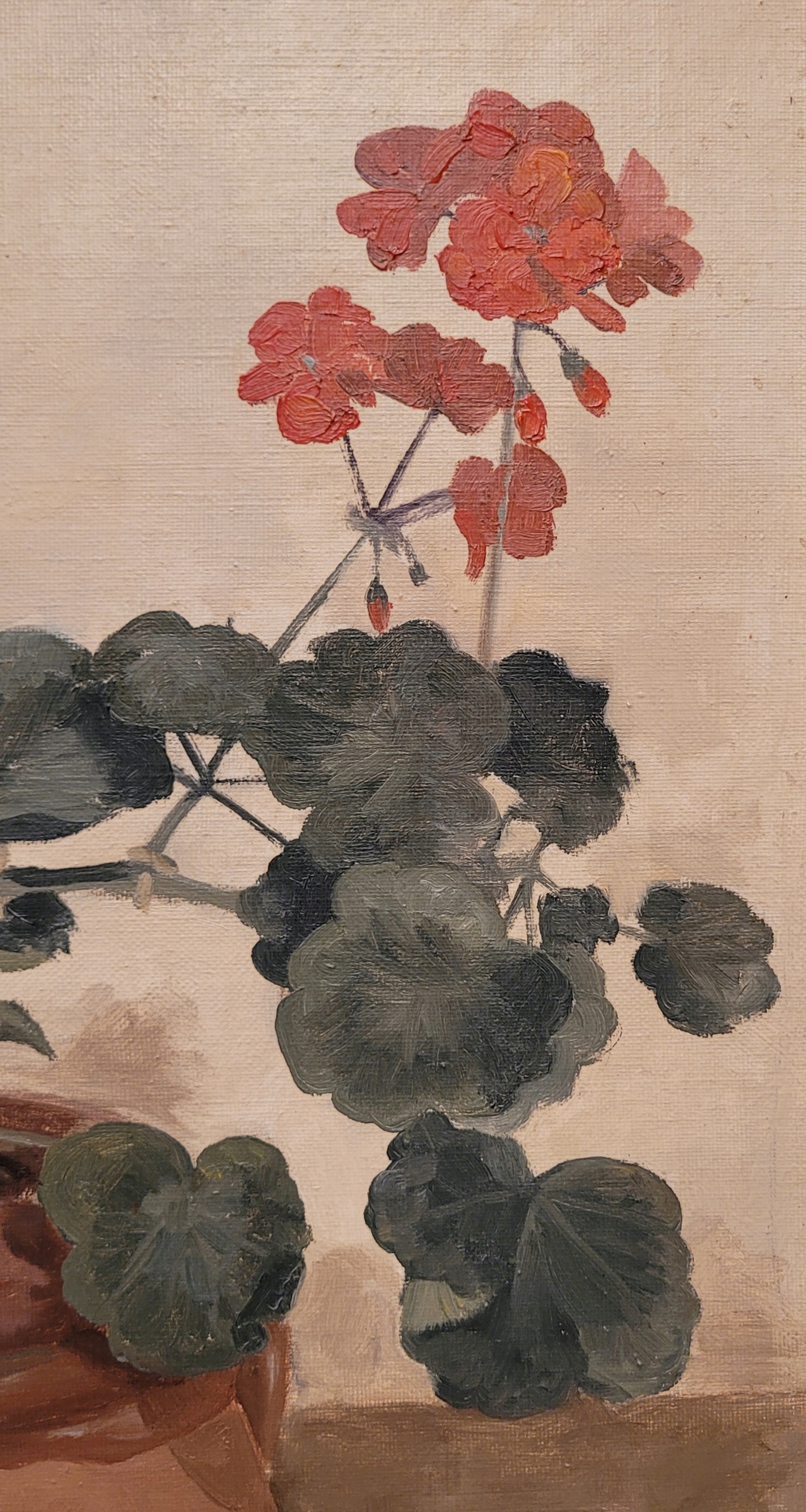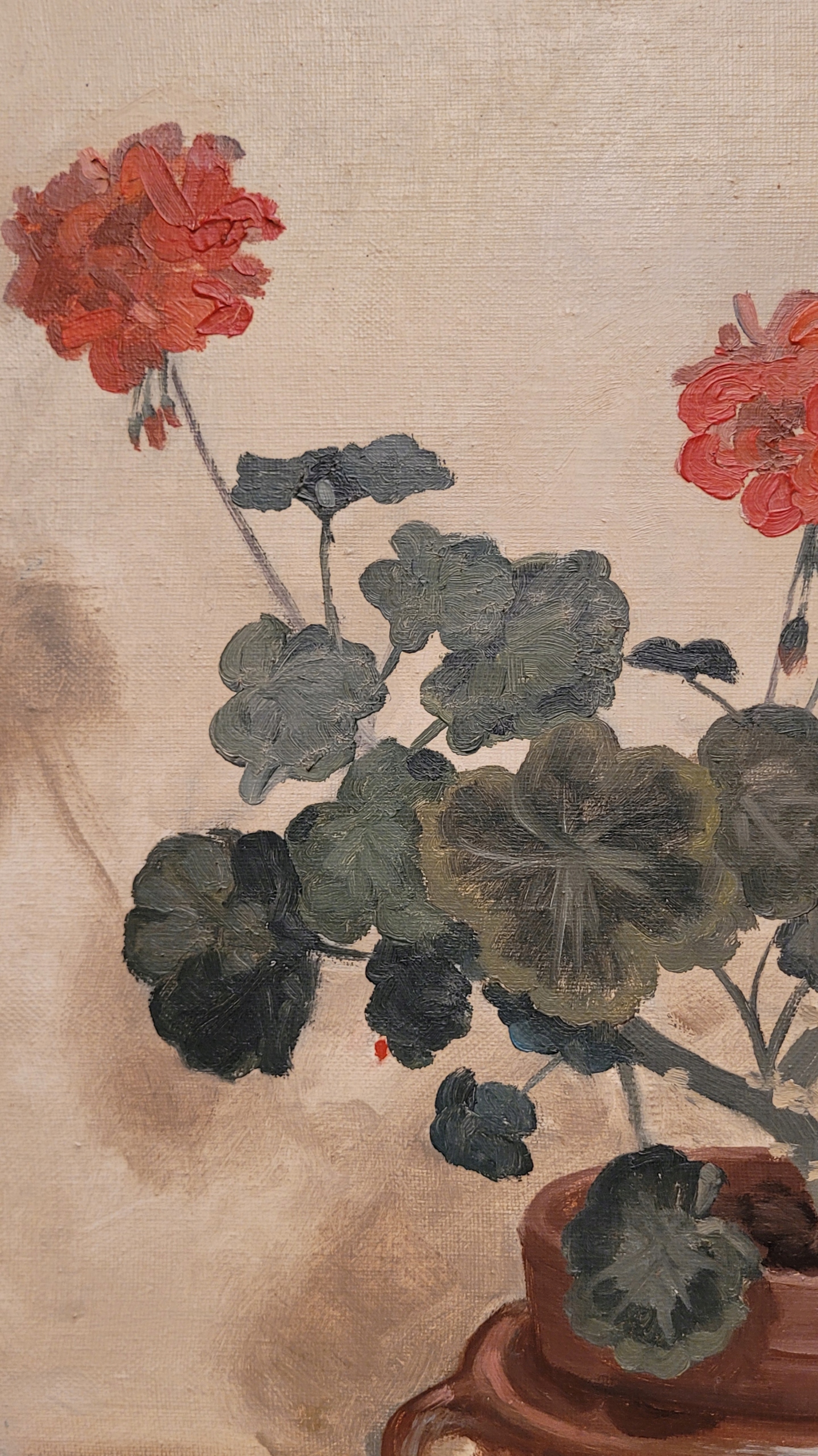 Тема продажи - красивая старая нефтяная картина "Герани в горшке".