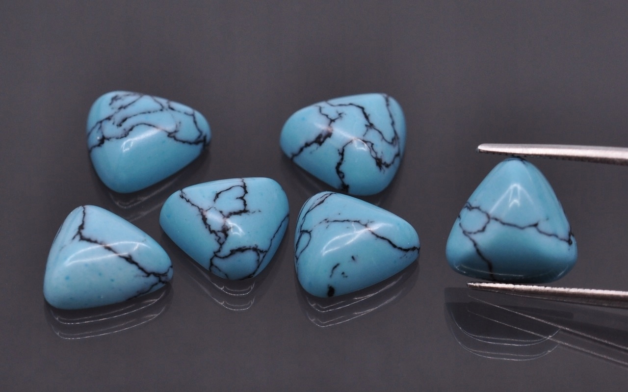 <р> Цвет: синий с черной прожилкой Размеры: 10х10х10мм Форма: треугольный кабошон Вес в граммах: 0,34Реконструированная бирюза - реконструированный камень, этот метод включает в себя сплавление порошка или мелких камней выбранного минерала (в данном случае гранита) при высокой температуре с последующим их медленным охлаждением. Таким способом получаются крупные блоки камней, которым можно придать любую форму.