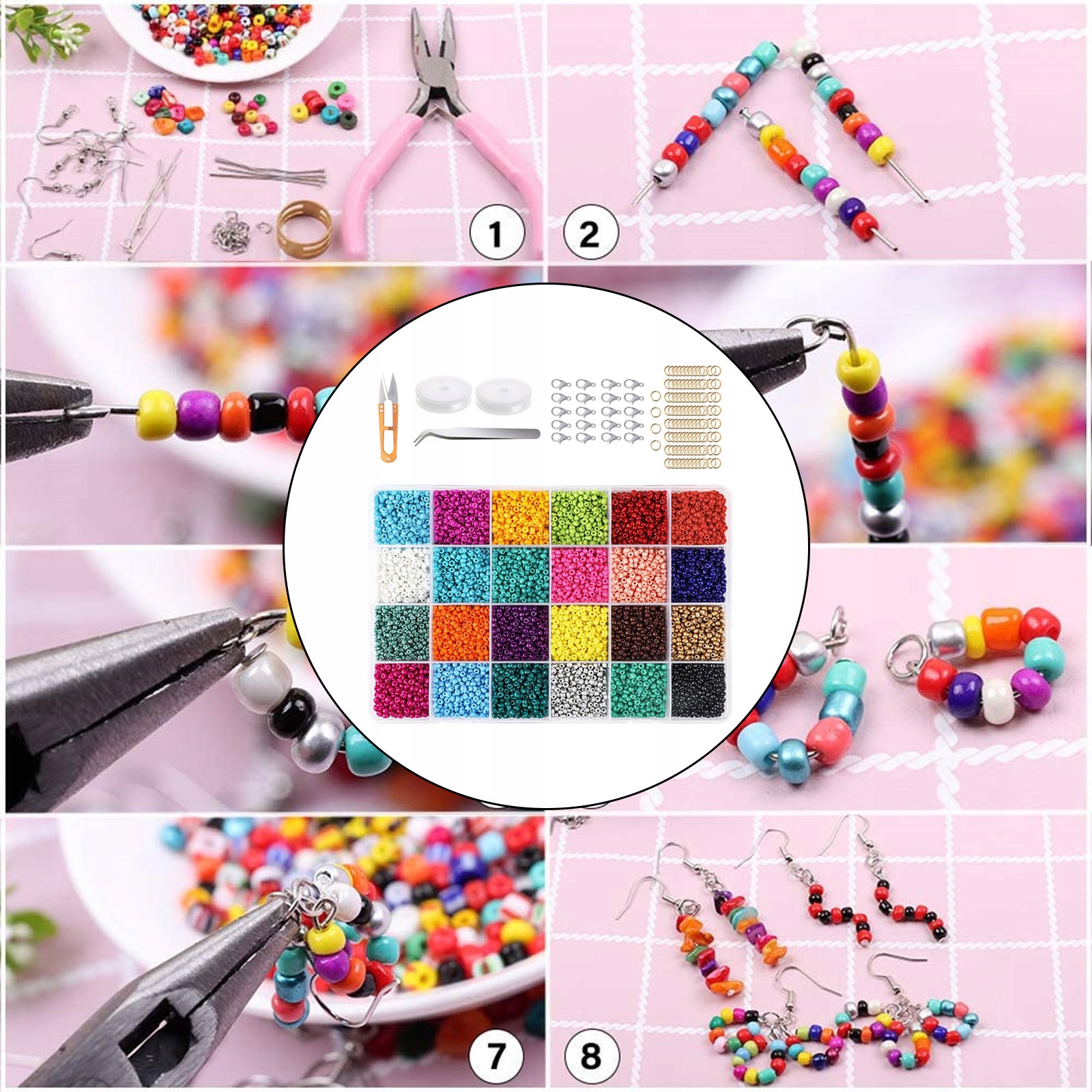 Содержимое упаковки: 24 бусины разных цветов, 2 мотка эластичной нити, 1 ножницы, 1 пинцет, 100 открытых петель, 20 карабинов.