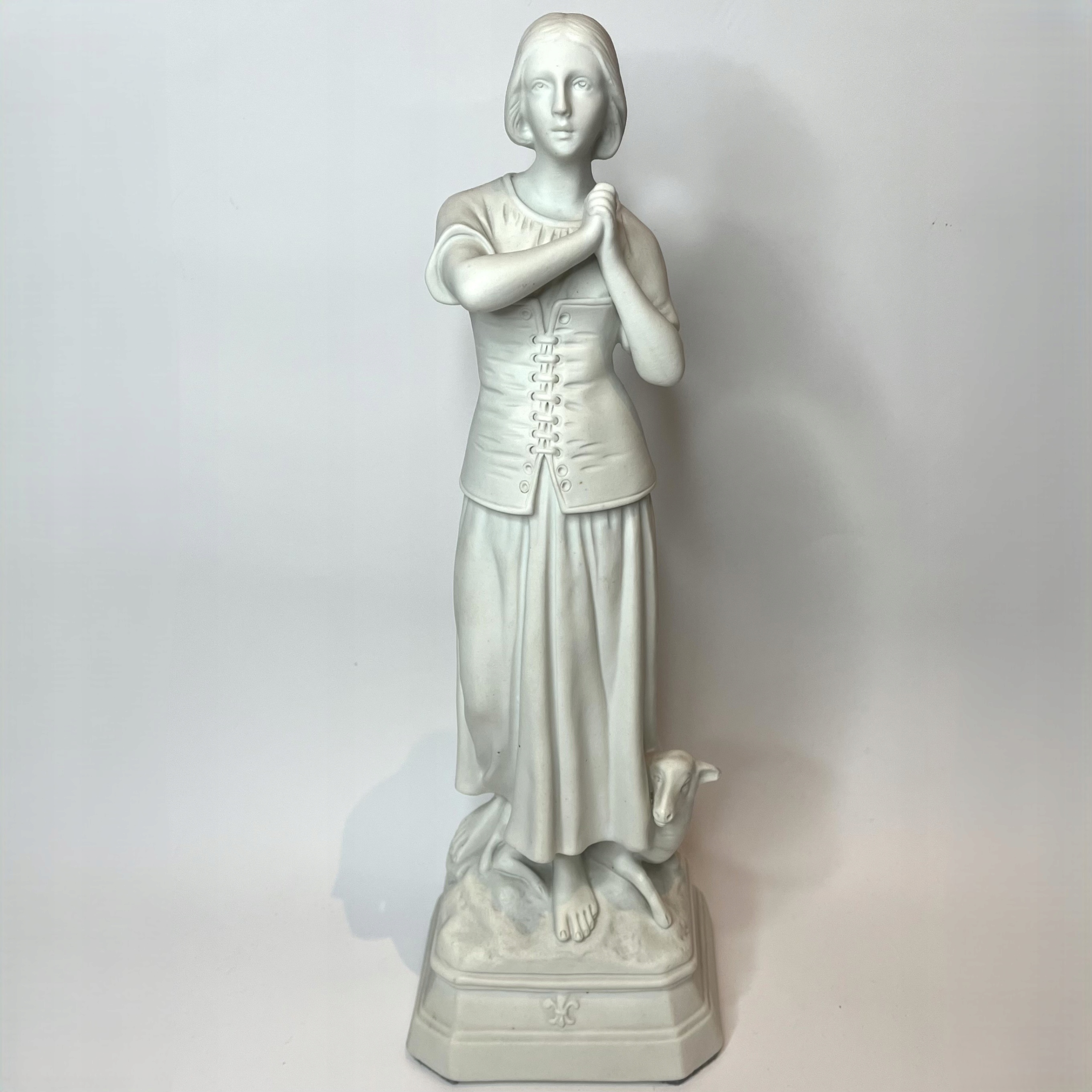 Большая статуэтка из бискового фарфора (неглазурованный), изображающая Жанну д'Арк в образе пастушки, в соответствии с иконографией XIX века, показывающую ее юные годы. Рядом с ней находится овца — символ чистоты и невинности, часто появляющийся в ранних изображениях святой.