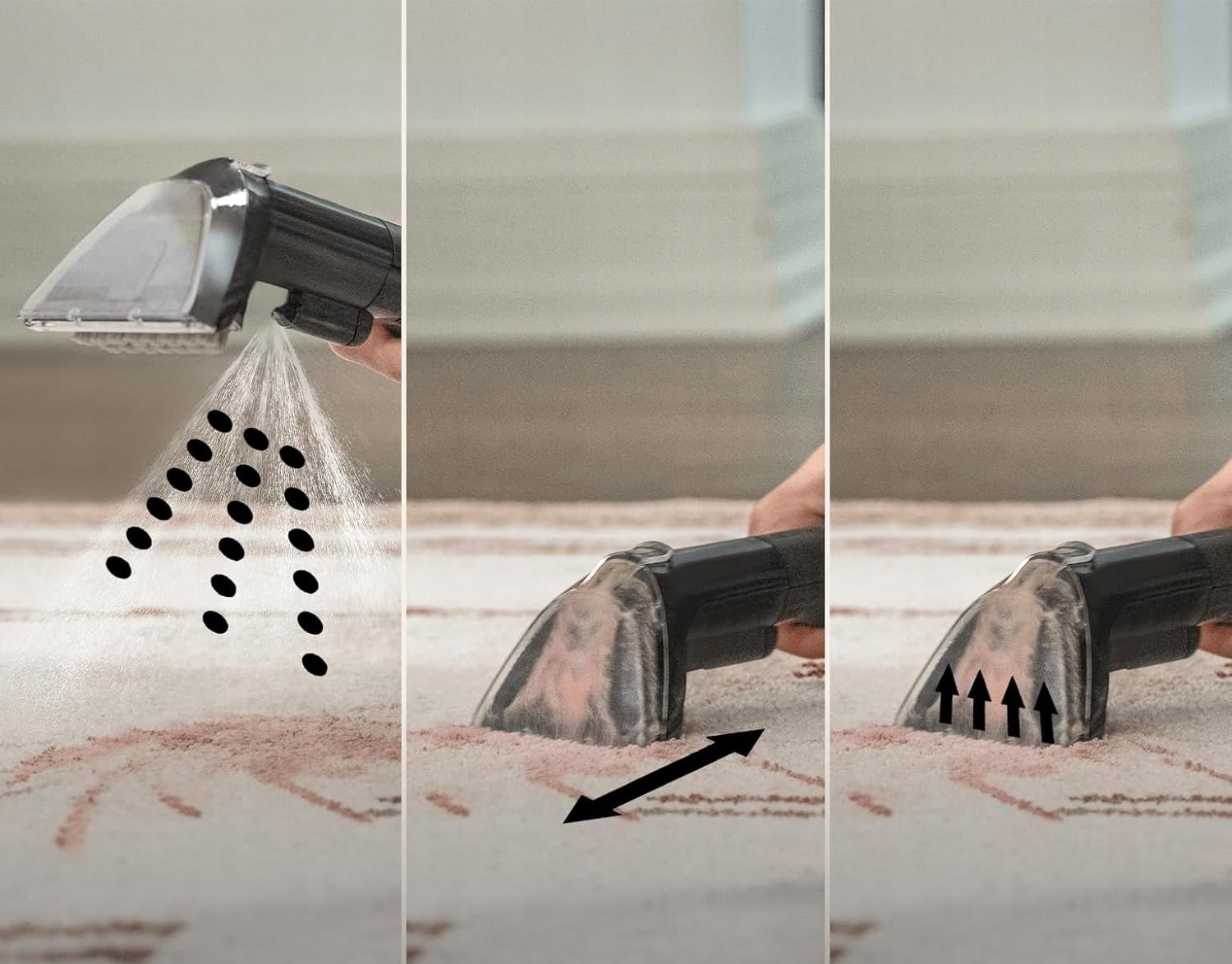 - Гигиеническое удаление пятна: Два отдельных резервуара для чистой и грязной воды, легко заполнять и опустошить. Постоянно удаляет пятна с ковров, обивки и других поверхностей.