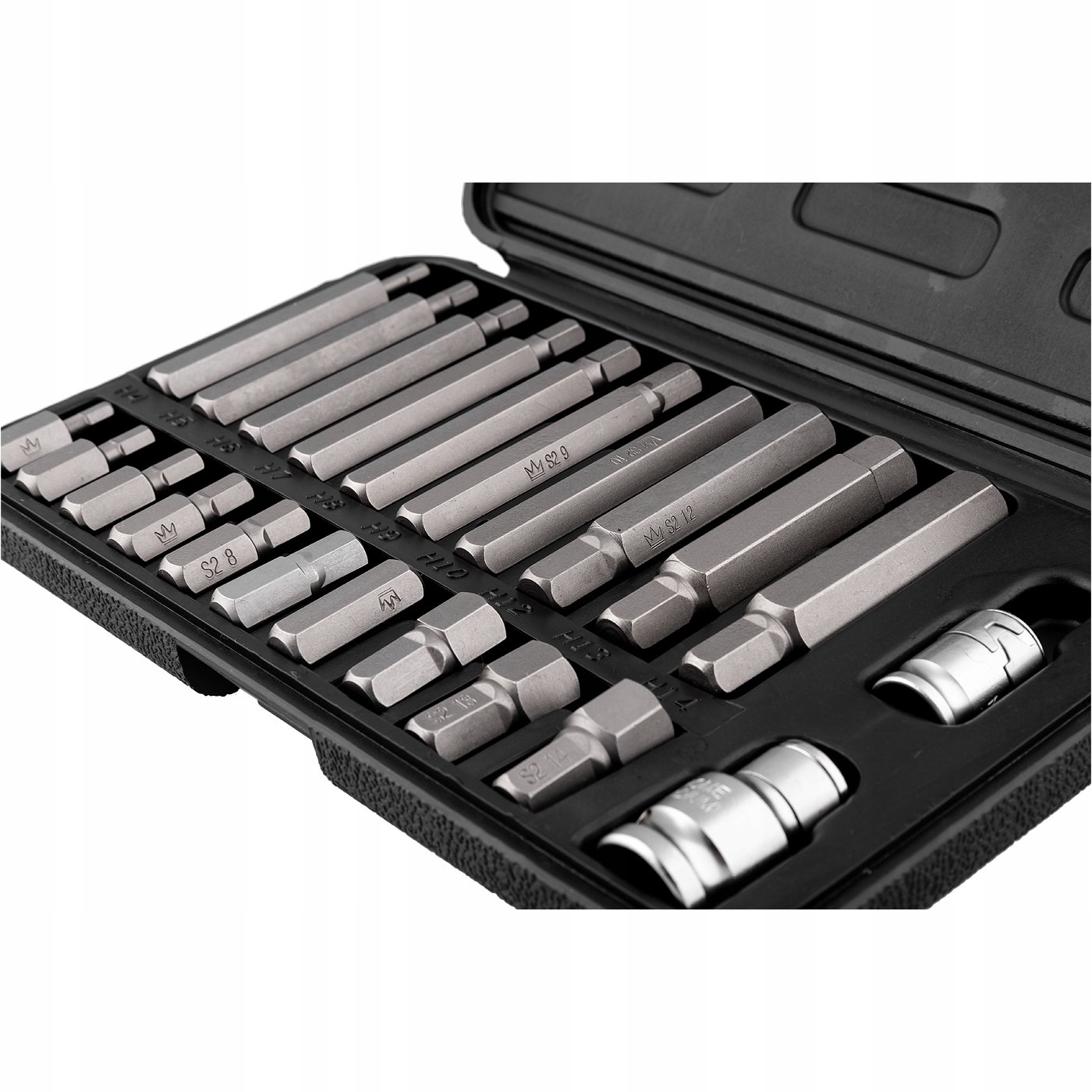 Набор из 22 внутренних шестигранных ключей 3/8", 1/2". В комплект входят внутренние длинные шестигранные ключи и крепление для ключей с храповым механизмом двух наиболее популярных размеров. Изготовленные из легированной инструментальной стали S2, они характеризуются высокой твердостью (HRC 58-62) и повышенной стойкостью к истиранию. Биты имеют монтажный диаметр 10 мм. Набор помещен в пластиковую кассету, каждая крышка в наборе имеет организованное место. Органайзер, закрывающийся на защелку, позволяет легко упорядочить насадки и обеспечить быстрый доступ к каждому.