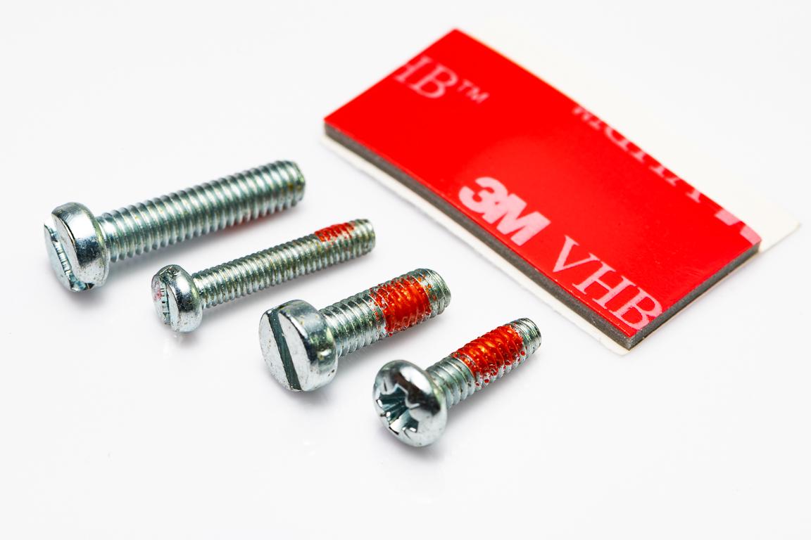В комплект входят 4 винта для самых популярных марок отверток и кусок прочного пенопласта 3М. монтажная лента .