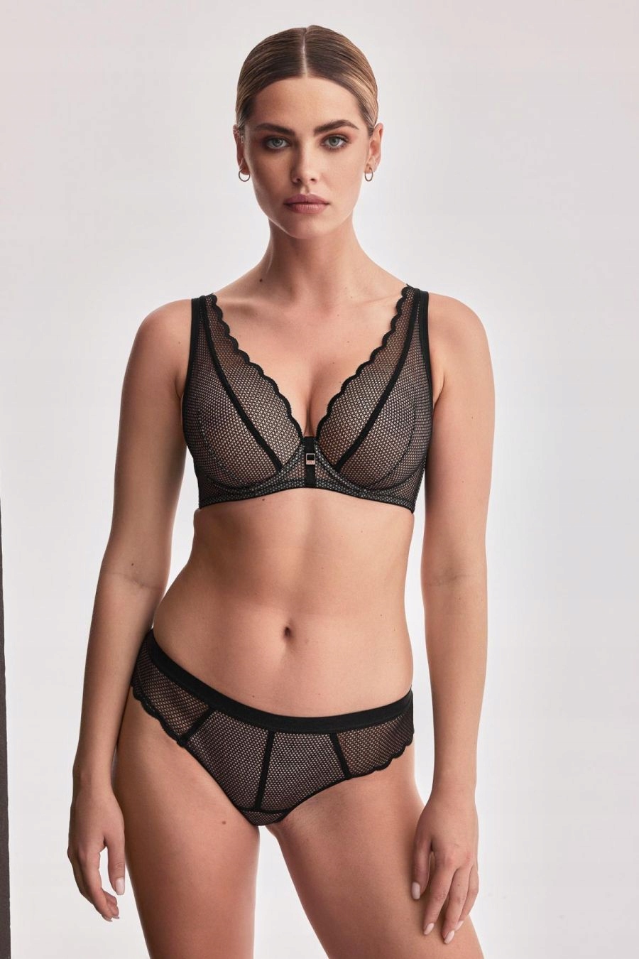 Удобный, мягкий бюстгальтер, рекомендуемый для средней груди, выполнен из черной эластичной ткани и современного кружева.