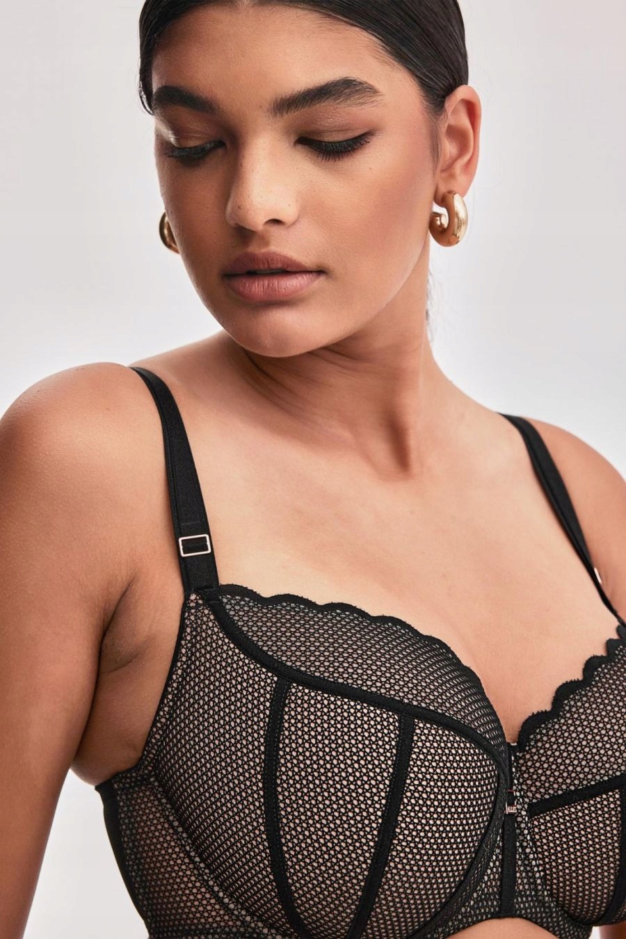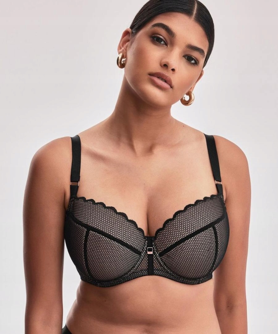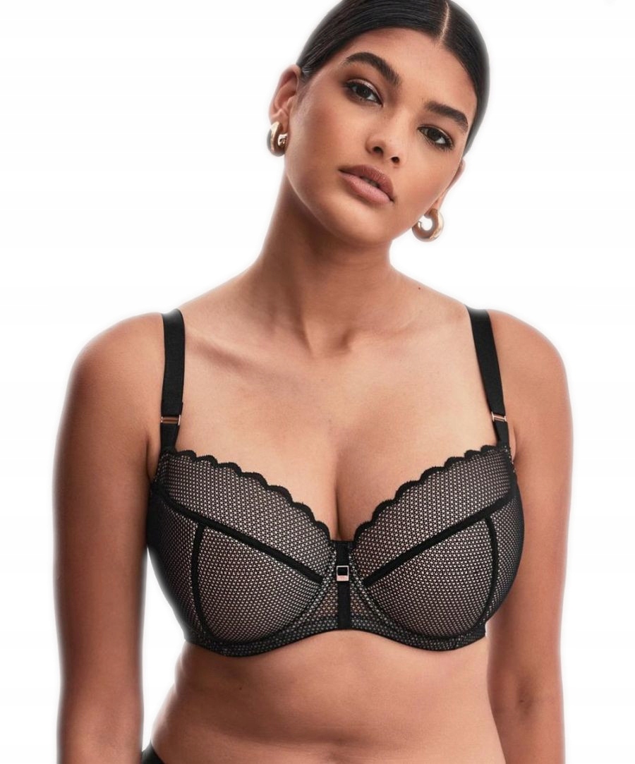 Полумягкий бюстгальтер, предназначенный для средней и большой груди, выполнен из черного эластичного плейна и современного кружева.