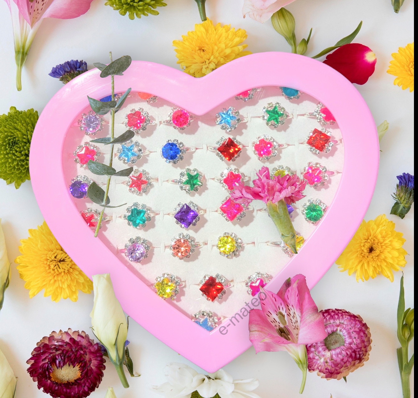 - 36 колец с блестящими элементами помещены в коробочку в форме сердца.