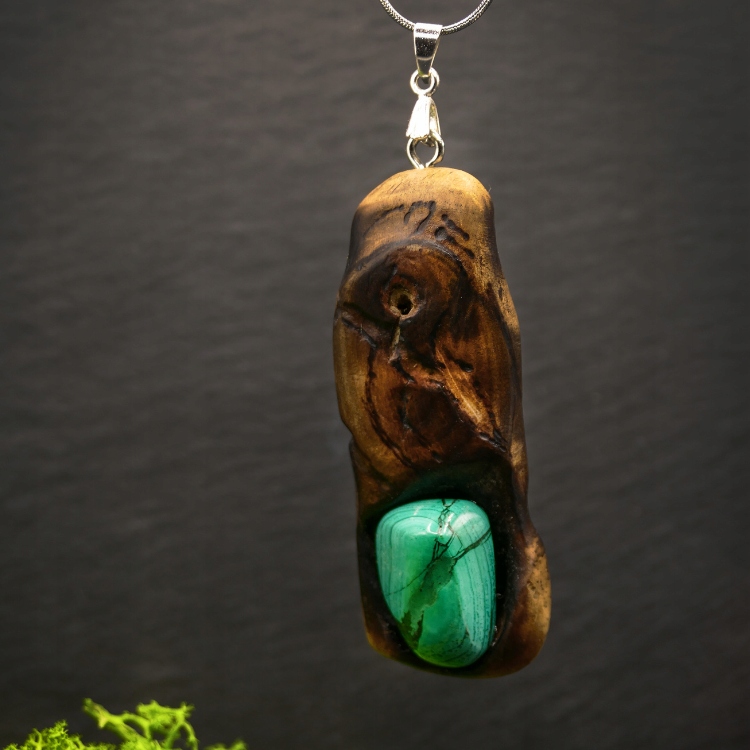 Biżuteria z duszą - wisiorek z malachitem i rzeźbionym drewnem orzecha