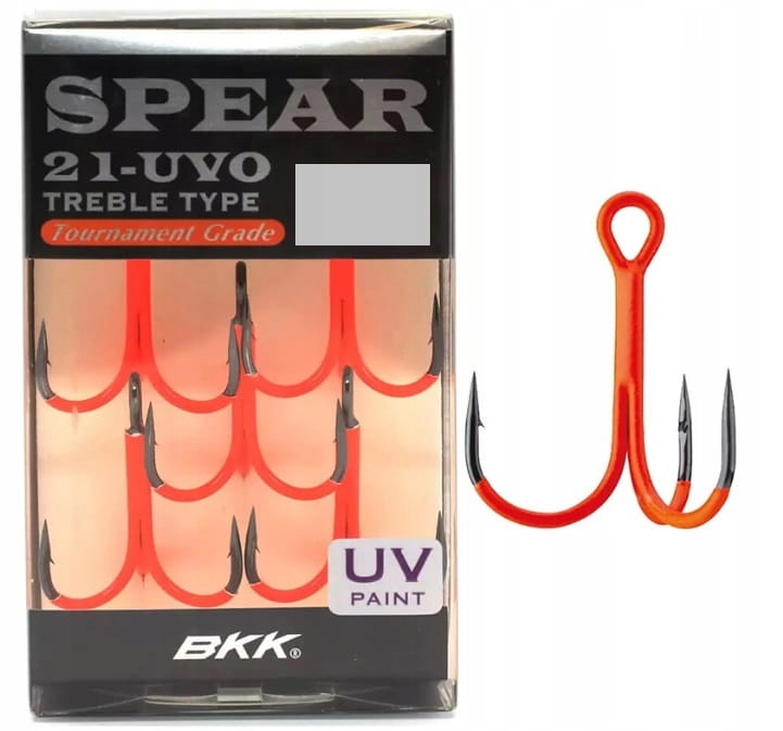 Кованый BKK Spear 21 UVO -проволока увеличивает прочность на 20%, что приводит к более прочному крюку. Небольшая длина передней части позволяет использовать его с различными типами приманки, такими как масляны, попперы, спиннеры и т. Д.