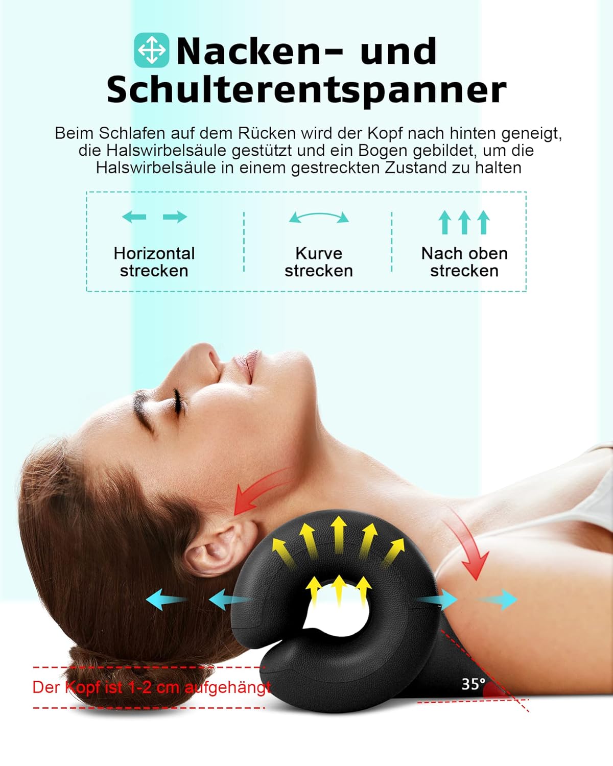 - Простой и эффективное физическое решение: 10 минут достаточно, чтобы облегчить шею. Это помогает восстановить правильную кривизну шеи, связанную с непрерывным использованием. Притяжение шеи может помочь регенерации после напряжения и проблем с стрессом, таких как головные боли, проблемы с шейками -позвонками, напряжение у основания черепа (например, плотные мышцы) и височно -нижнечелюстного синдрома.