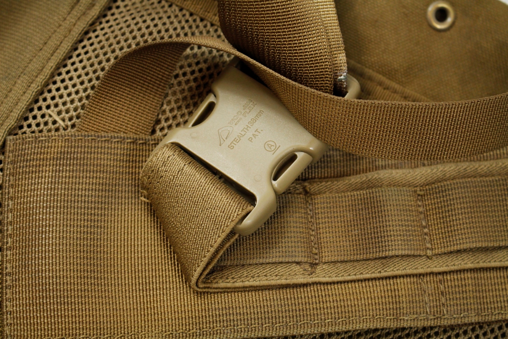 Нагрудный ремень вмещает баллистические пластины и оснащен лямками S.T.R.I.K.E./MOLLE, которые позволяют надежно и плотно прикрепить подсумки, кобуры и другие аксессуары.