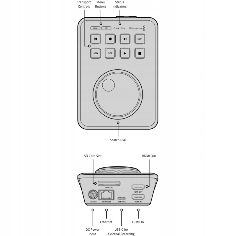 hyperdeck huttle имеет панель управления, которая очень быстро используется. Кнопки такие же, как и в традиционных передавающихся ресурсах. Просто нажмите кнопку записи, чтобы немедленно начать запись. Запись будет сохранена в формате файла, который был установлен в меню записи. Другие кнопки используются для игры, вернуться к началу клипа и перейти к следующему клипу. Кнопки были специально разработаны с помощью Blackmagic Design с точки зрения высочайшего качества. Большая ручка поиска металла для функций трансфера, пробега и прокрутки позволяет быстро найти зажимы. Все функции управления Okem также могут быть запущены удаленно с использованием сети Ethernet.