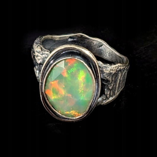 Кольцо из оксидированного серебра 925 пробы, украшенное натуральным радужным опалом с Эфиопией с фасетным вырезом по всей поверхности. Размеры каменной оправы: 18 х 13 мм. Ширина обручального кольца 10-4 мм. Размер украшения 17, возможно увеличение максимум до 18. Вес 5,2 грамма. Кольцо будет отправлено в декоративной коробке.