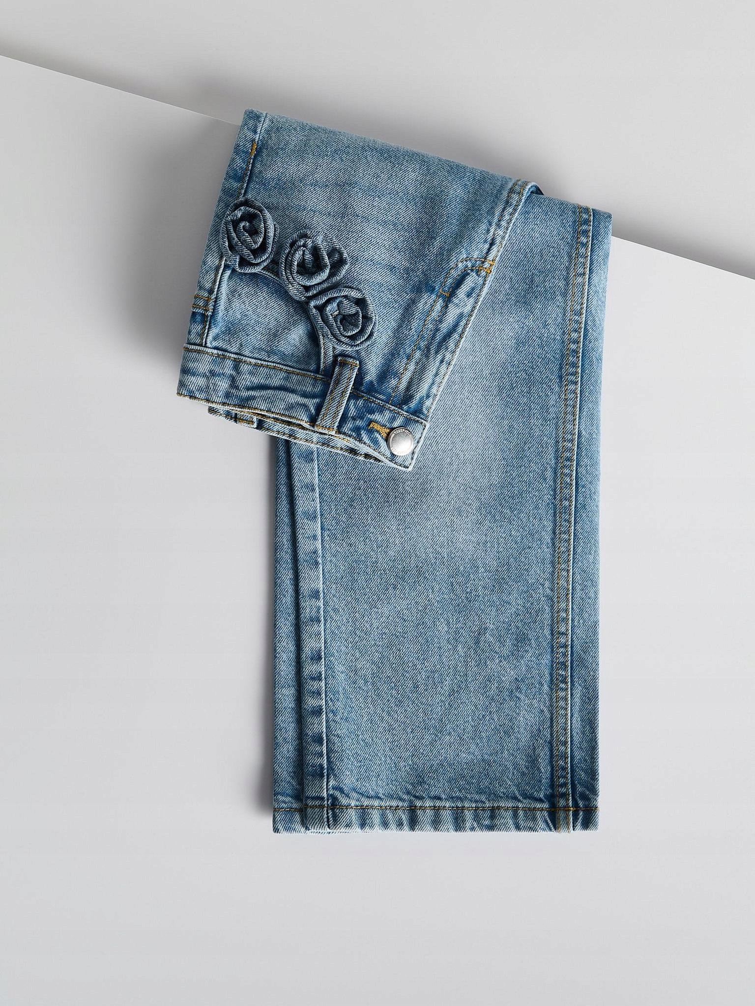 Голубые брюки джинсы широкие ноги декоративное цветочное применение 146