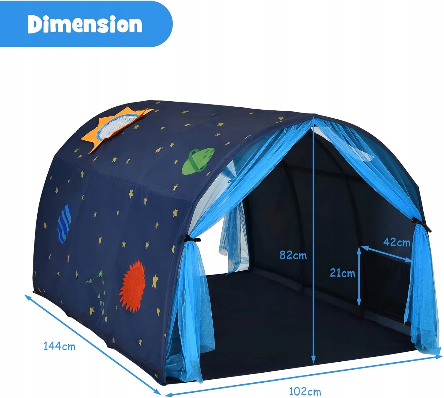 Большое игровое пространство: в разложенном виде дети получают большое игровое пространство размером 144 x 102 x 82 см. Детская палатка подходящего размера подходит для большинства двухъярусных и двухъярусных кроватей, поэтому дети могут весело спать по ночам.