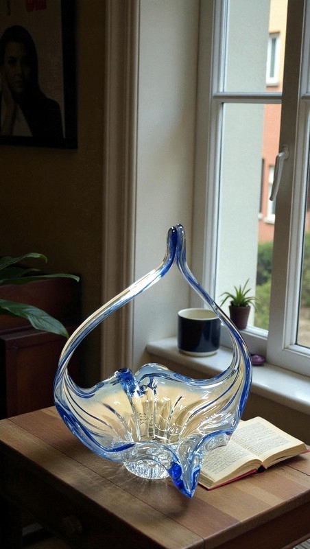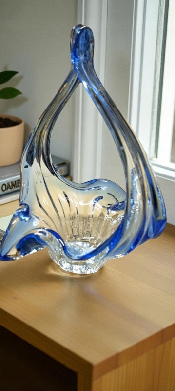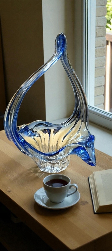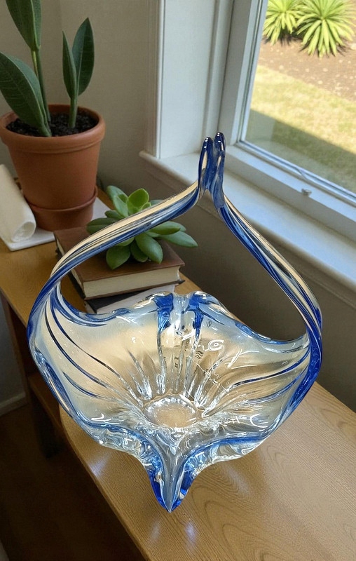На аукционе представлена корзина ручной работы из бесцветного стекла с синими вставками. Обратите особое внимание на точность изготовления и уникальные цвета. Состояние очень хорошее.