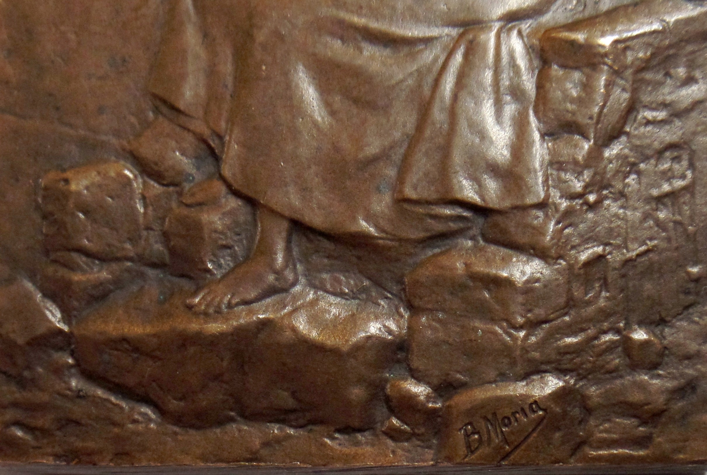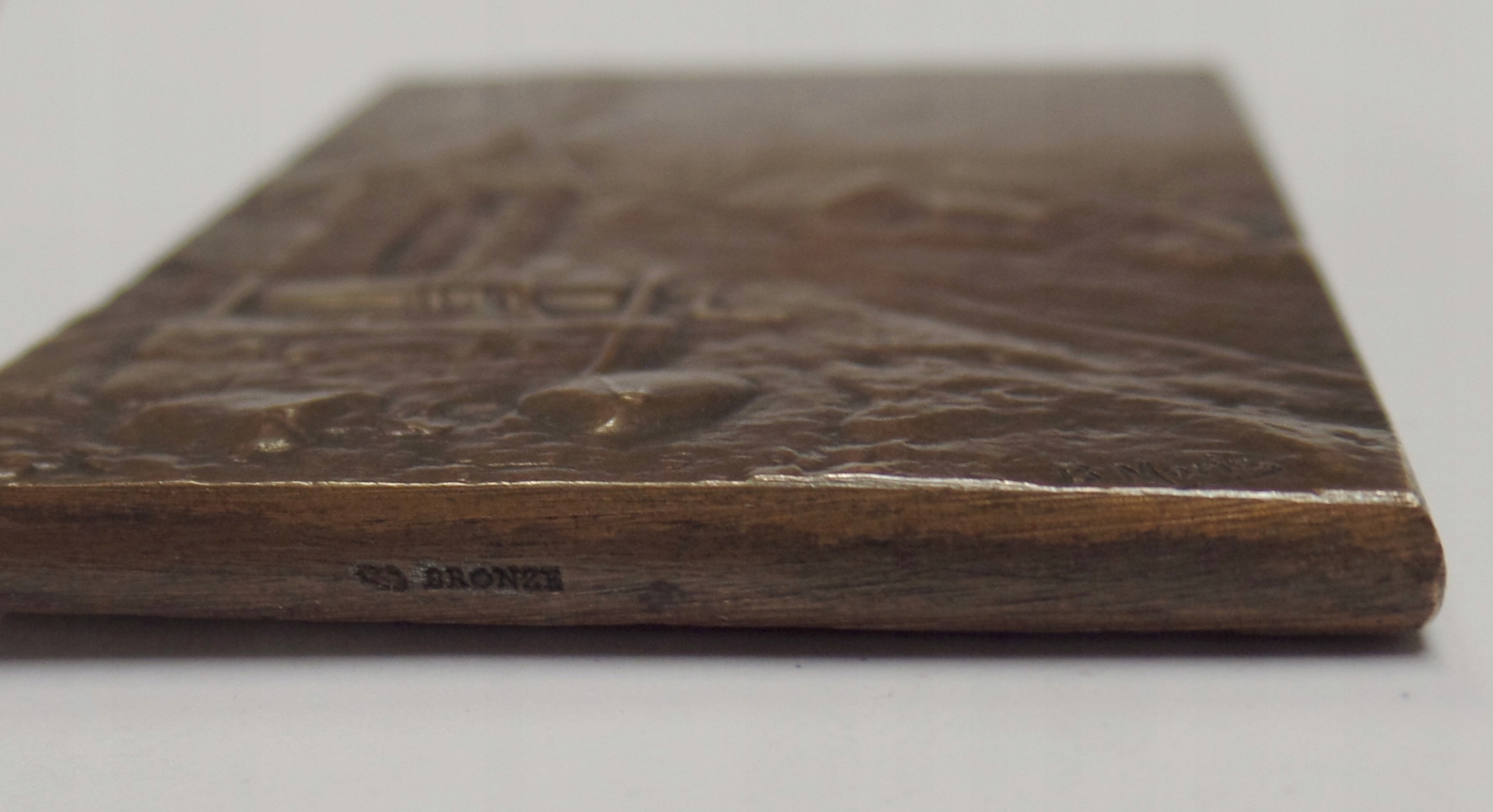 Бланш-Адель Мория (1859-1926) Мемориальная доска «В деревне» («Au vilage»), двусторонняя, отлитая из бронзы, размеры: 64 х 45 х 4 мм. Два изображения: аверс: Девушка за шитьем на лестнице перед домом; реверс: «Деревенский колодец».Мемориальная доска подписана с обеих сторон. Маркировка материала выбита на краю.