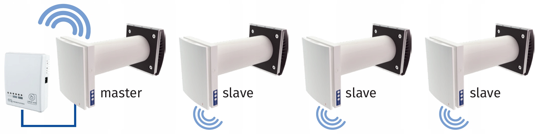 VENTO Expert A50-1 S10 W V.2 может работать как самостоятельная вентиляционная установка или подключаться к другим установкам и управляться основным блоком (Master). В данном случае сигнал от пульта дистанционного управления принимает только одно устройство.