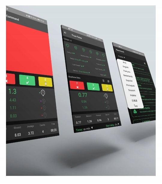 Приложение на польском языке Имеет 22 различных режима обучения для одного или нескольких участников! «Стандарт» — измеряет время от света до прикосновения «Битва» — при двух игроках проигрывает самый медленный «Верно-неверно» — поймайте правильный цвет, чтобы набрать очки «Память» — запомните цвет и повторите «Вручную» — тренер может решить в реальном времени, какая лампа должна включиться