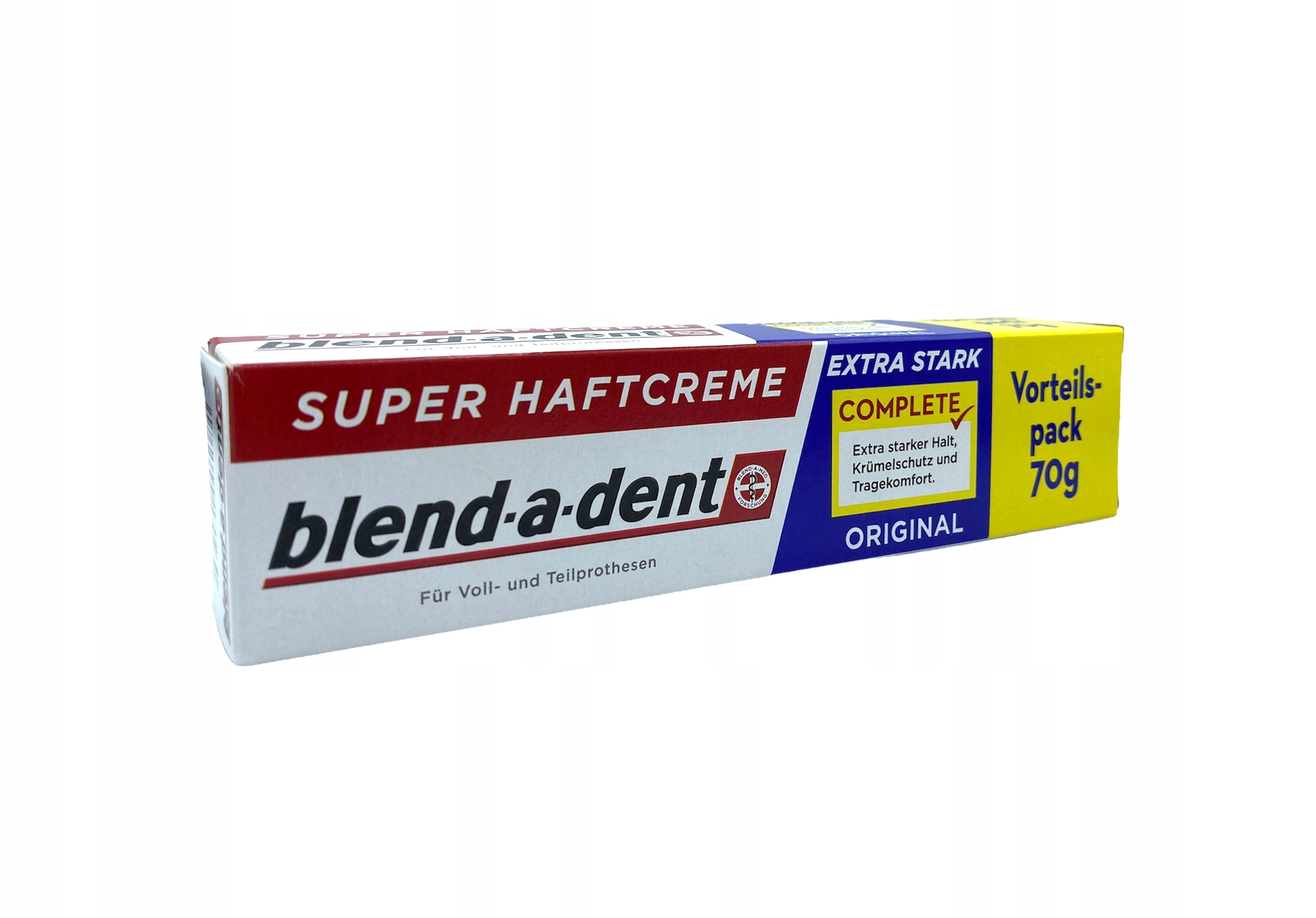 Клей для крепления зубных протезов Blend-a-dent super haftcreme Complete exra stark – сверхпрочный клей для зубных протезов – обеспечит вам длительный эффект в течение всего дня!