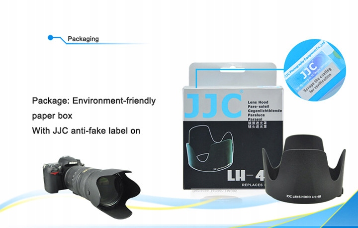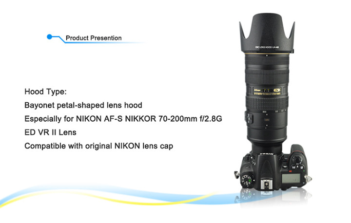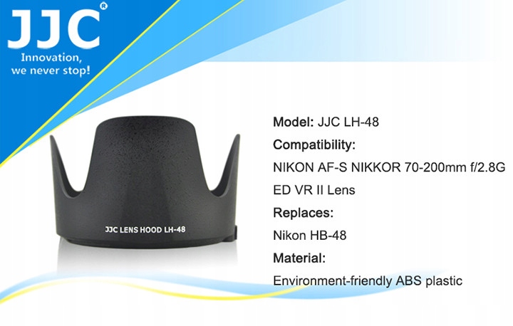 Бленда JC LH-48 посвящена НИК. АФ-С НИКК. 70–200 мм f/2,8G ED VR II. Бленда предотвращает попадание нежелательного постороннего света в объектив, выдвигая и закрывая конец линзы. Внутри он имеет матовое антибликовое покрытие, которое дополнительно предотвращает или ограничивает блики от линз. При открытой диафрагме виньетирование отсутствует. Форма бленды «лепесток» обеспечивает максимальное покрытие объектива при минимальном весе и площади диафрагмы. Его также можно прикрепить к объективу в перевернутом положении для более компактного хранения. Крышка также позволяет прикрепить фильтр и бленду. Поскольку конец линзы выдвинут, у вас также есть преимущество дополнительной защиты от случайных ударов. Бленда JJC LH-48 заменяет бленду NIK. НВ-48.