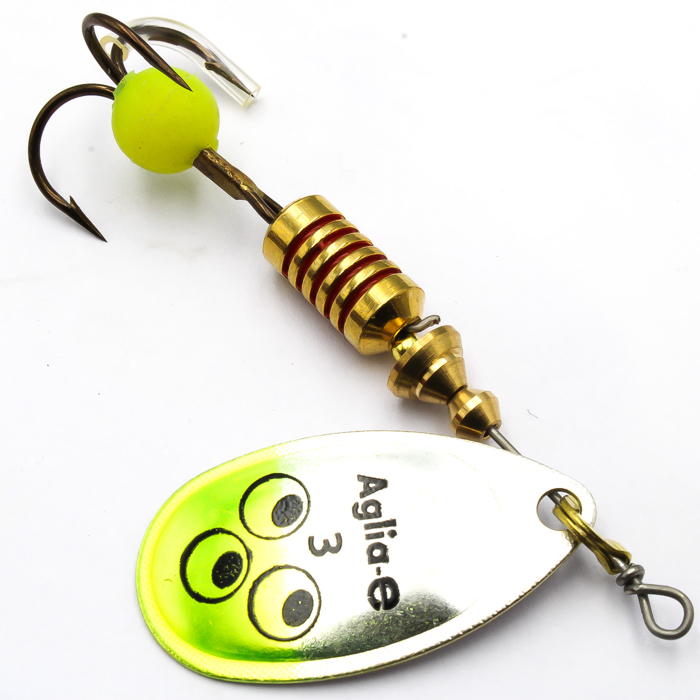 При разработке Aglia -e было использовано явление флуоресценции под воздействием УФ (ультрафиолетовых) лучей, невидимое для человеческого глаза. Приманка Aglia покрыта покрытием, содержащим чувствительный к УФ-лучам пигмент, благодаря которому Aglia-e отражает УФ-лучи на большой глубине и отлично видна, провоцируя хищника на атаку, когда другие приманки становятся практически незаметными. На крючке расположен шарик из мягкого материала, имитирующий самый вожделенный корм рыб всех видов – икру. Этот шар также отражает ультрафиолетовые лучи и действует как отражатель на большой глубине, указывая хищникам путь к цели.