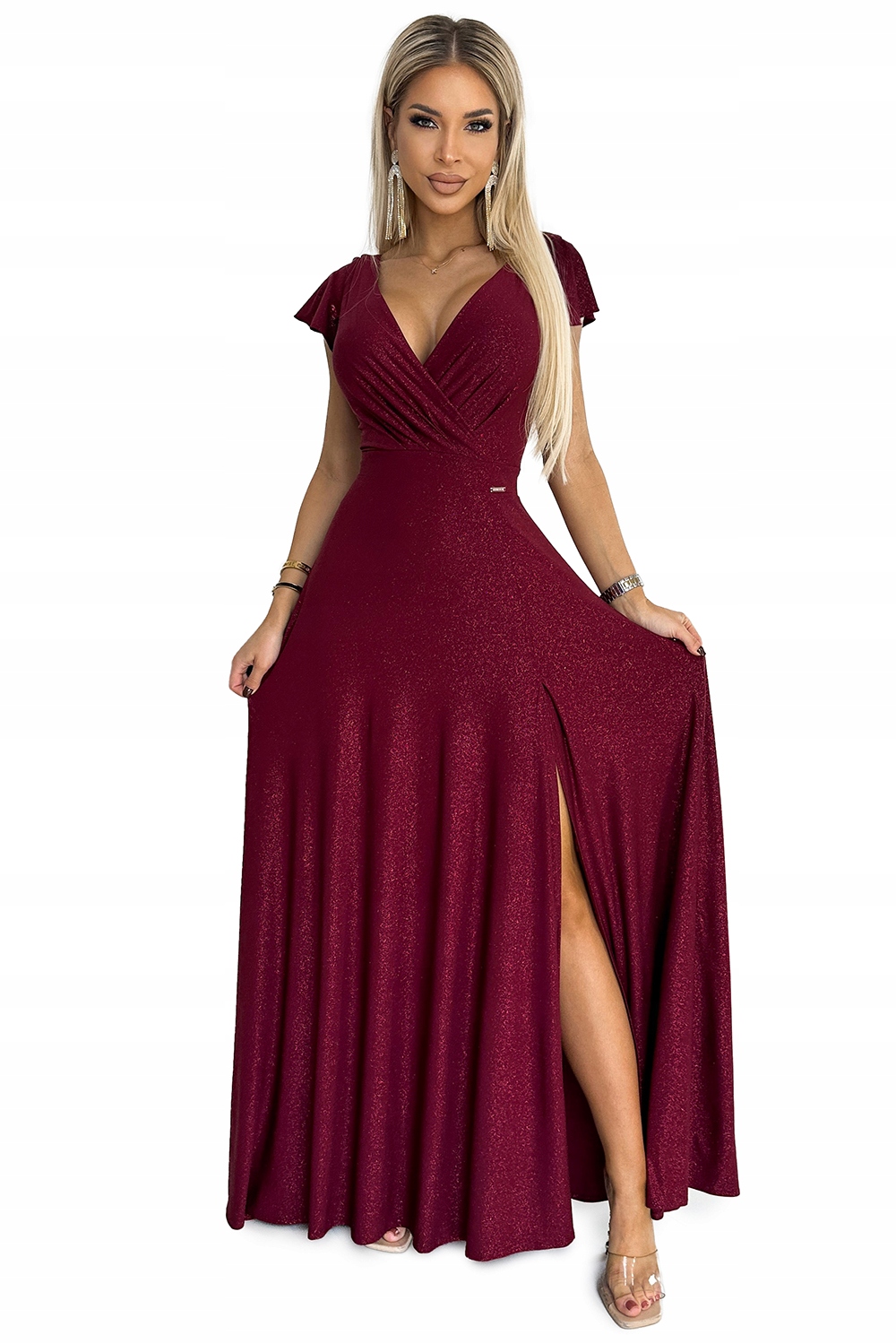 CRYSTAL – длинное блестящее платье макси с вырезом-конвертом и разрезом на ноге. Цвет: бордовый с блестками. Платье красиво обнажает зону декольте и прекрасно смотрится во время танцев. Застегивается сзади на закрытую молнию. Польский продукт.