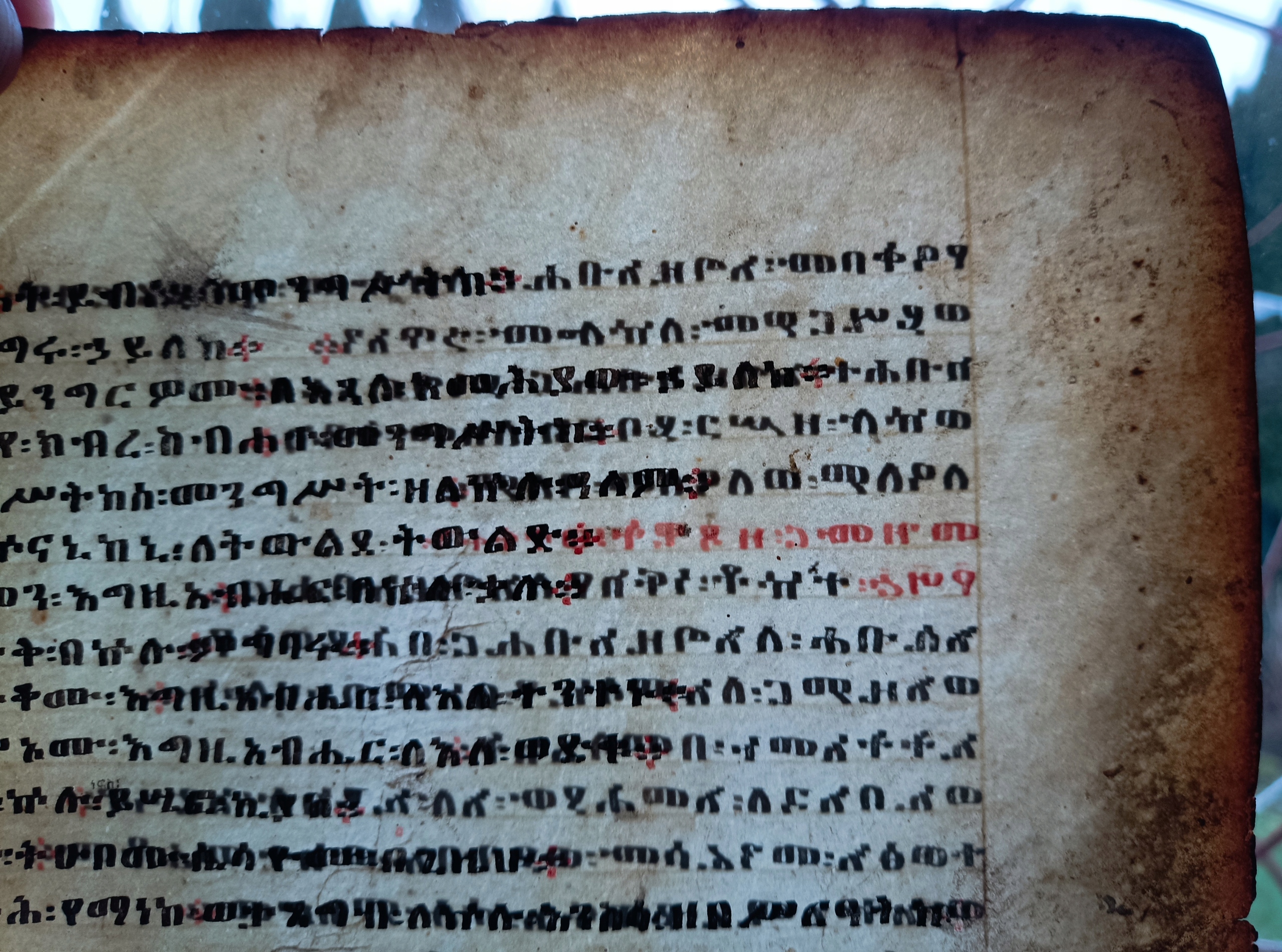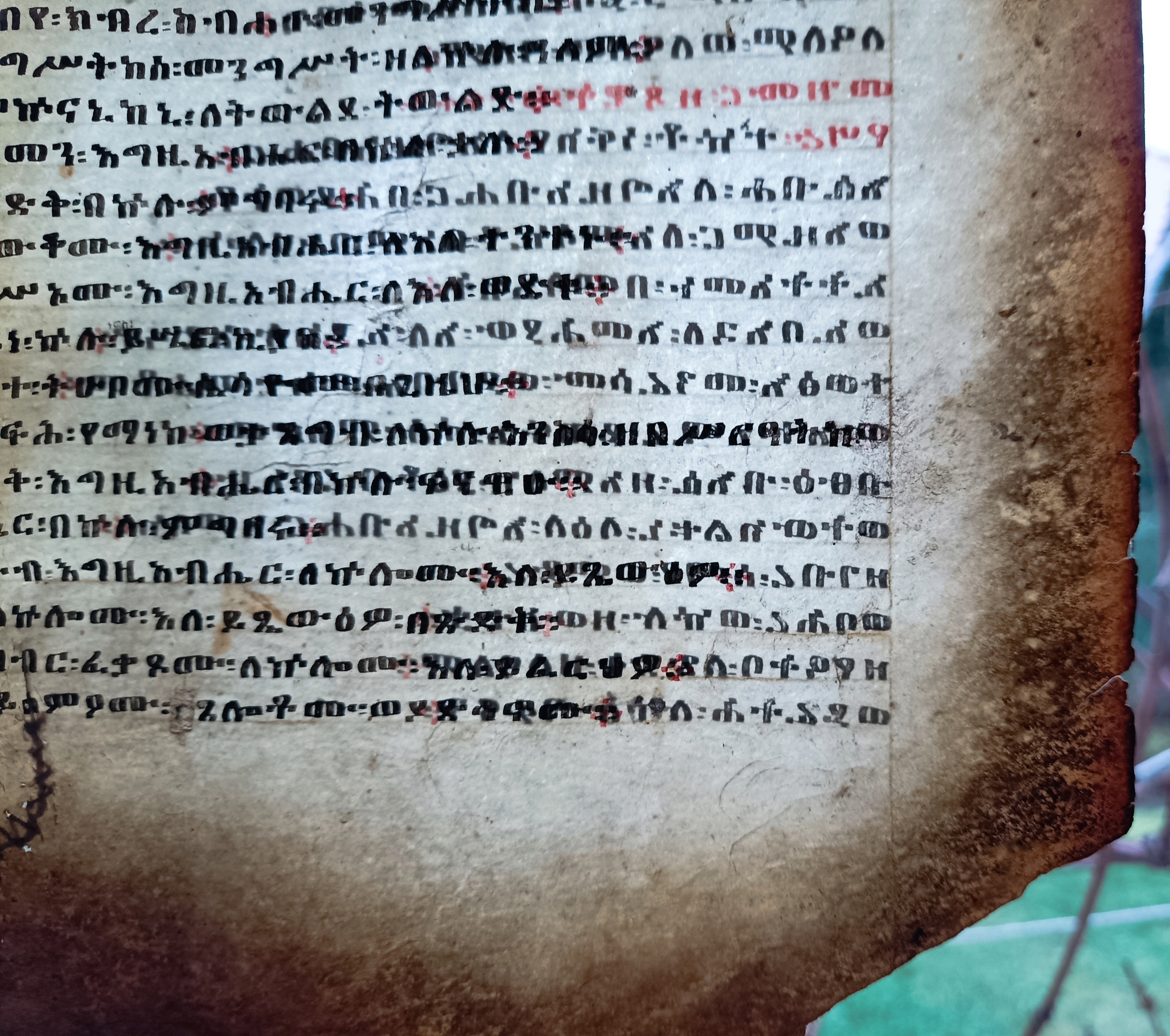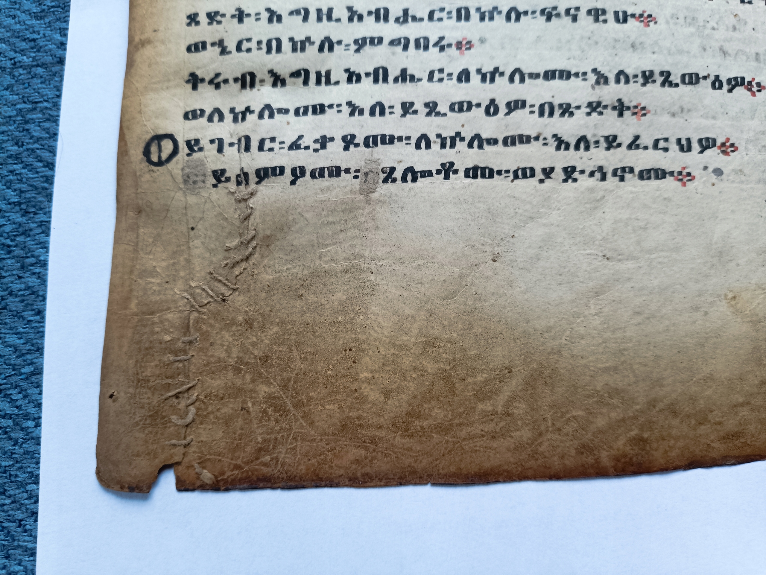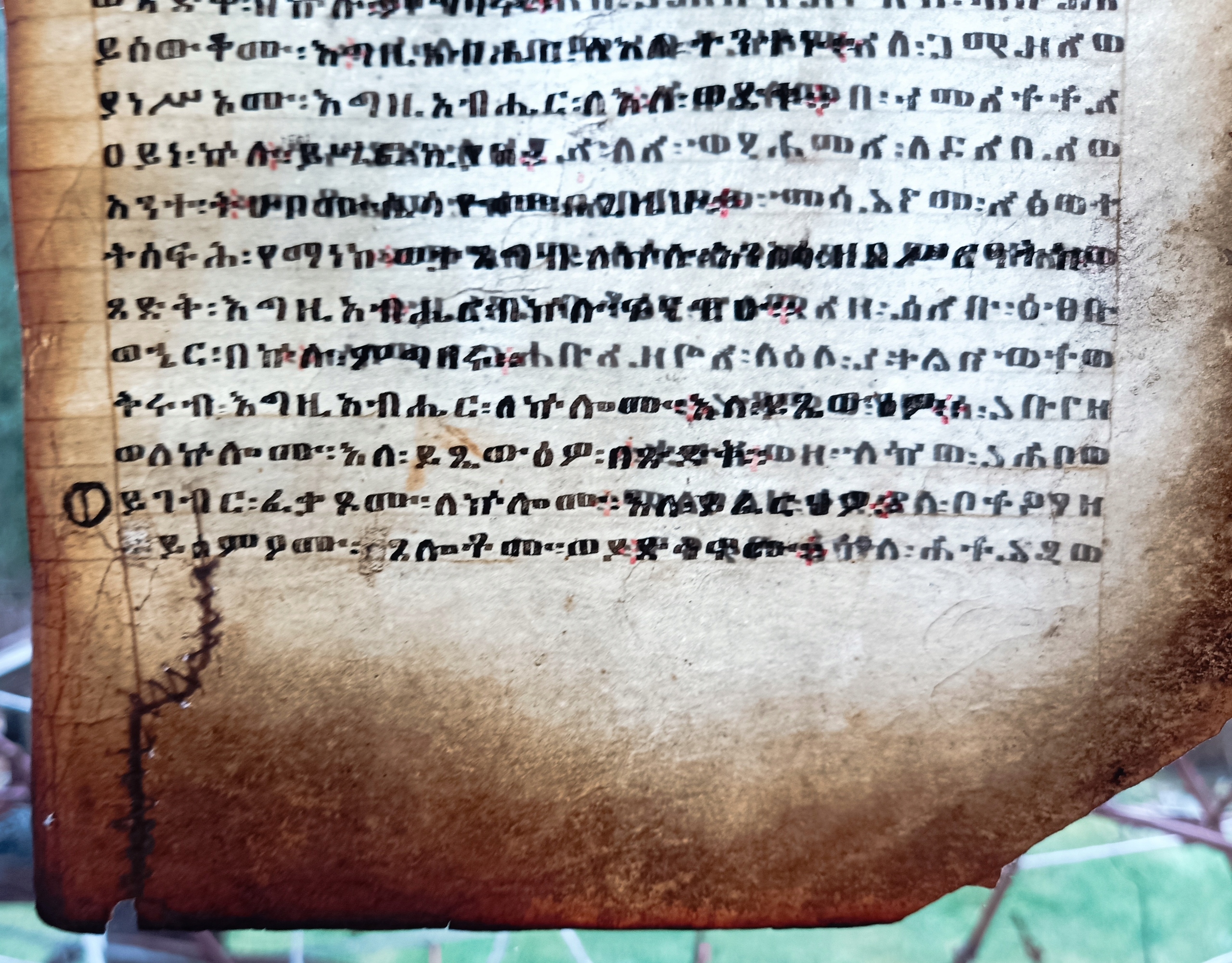 Вы можете четко увидеть, как подготовка карты для написания: следы линейного, сделанного из металлического стилуса - писать равномерно. Вертикальные впечатленные линии определяют ширину краев. Тонкие отверстия с одной стороны указывали, где сжать линию. Только пергамент, подготовленный там, был сохранен. Буквы можно сравнить, поиск фрагмента Genesis в GYYZ, опубликованном в Википедии. Группа, используемая в Королевстве Аксум в речи и письме с 4 -го века. Между 11 -м и 19 веком это был литературный язык, теперь это ли только литургический язык ортодоксальной эфиопской церкви. Эфиопская традиция указывает на его происхождение от короля, который пришел из областей
