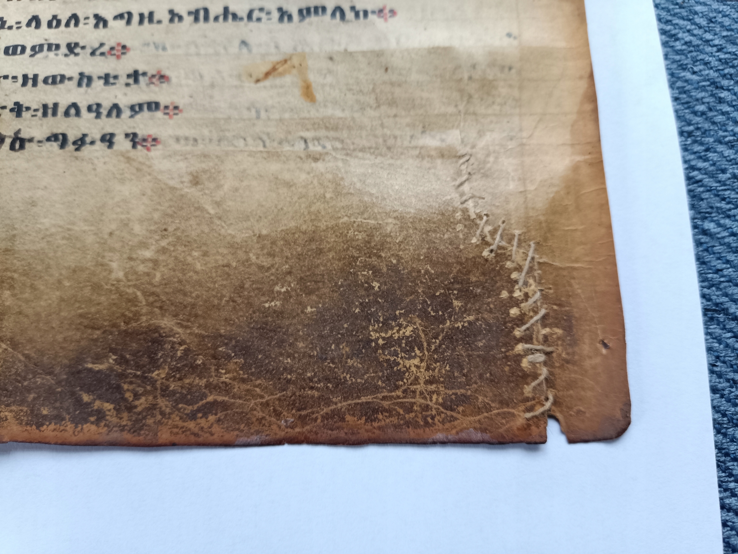 nasz очень похожа. Фрагменты Библии или, может быть, Библия? В конце предложений черный и красный набор точек и линий--это «точка», заканчивающая предложение? Карта около 18 х 20 см. Пергамент довольно жесткий - отличается от того, что используется в Европе - может быть, из -за другой кожи (от какого -то африканского животного? Например, антилопы? Или, может быть, только из коз?) P> вы можете видеть, что рукопись была важна для читателя , так как мы видим следы слез. Уголок карты также был выброшен из старости
