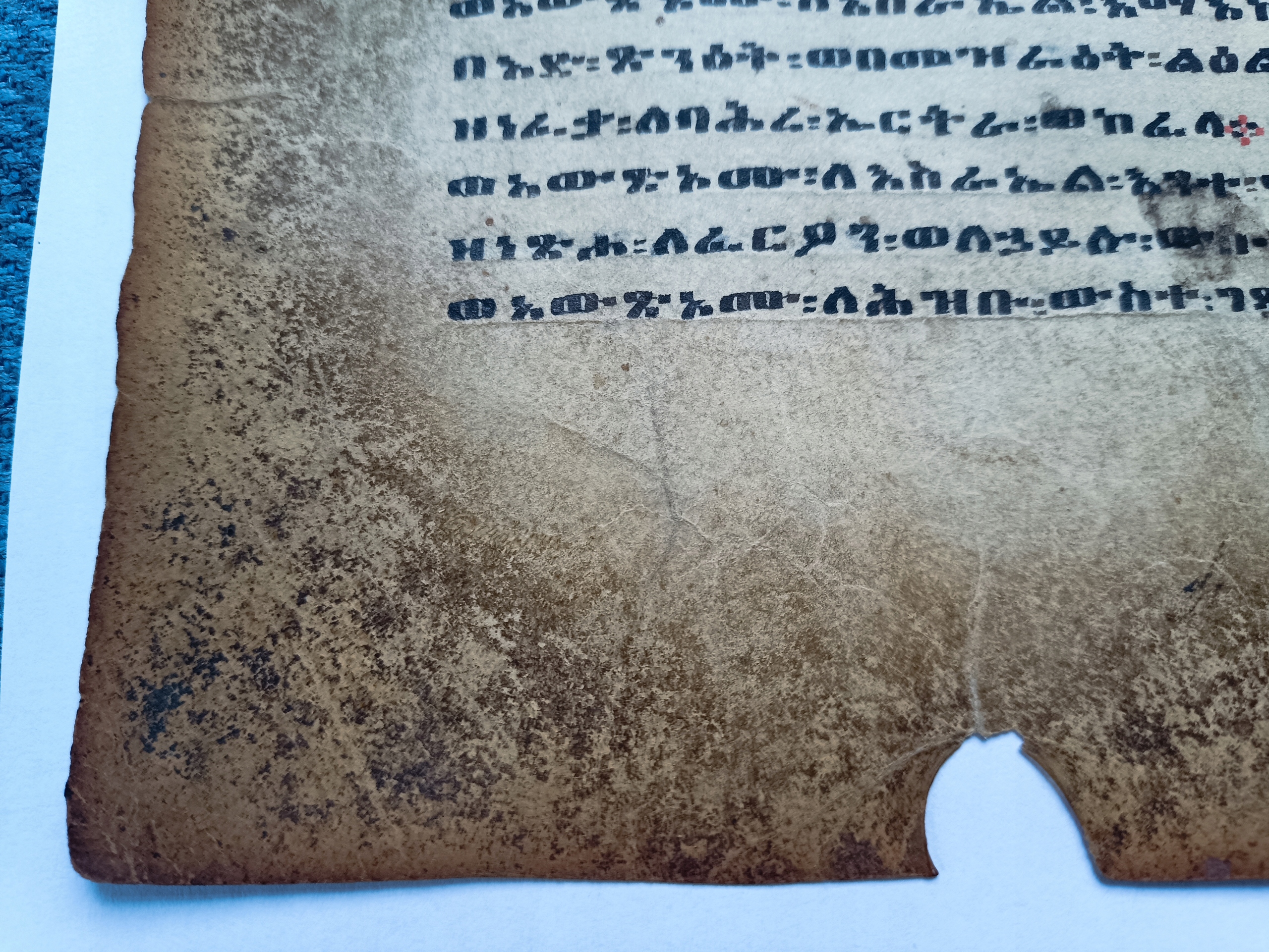 Рукопись в Geez (Gyyz) на пергаменте. 1 карта сохранена с обеих сторон. Трудно определить, что старо, потому что Гиз - мертвый язык. Он прекратил использоваться в 10-10-м веке. Затем он существовал только в литературных и литургических текстах. В отличие от других семитских языков, Гиз написан слева направо. Тщательно вы можете оценить создание рукописи в 17-18-м веках, но это также может быть намного старше.