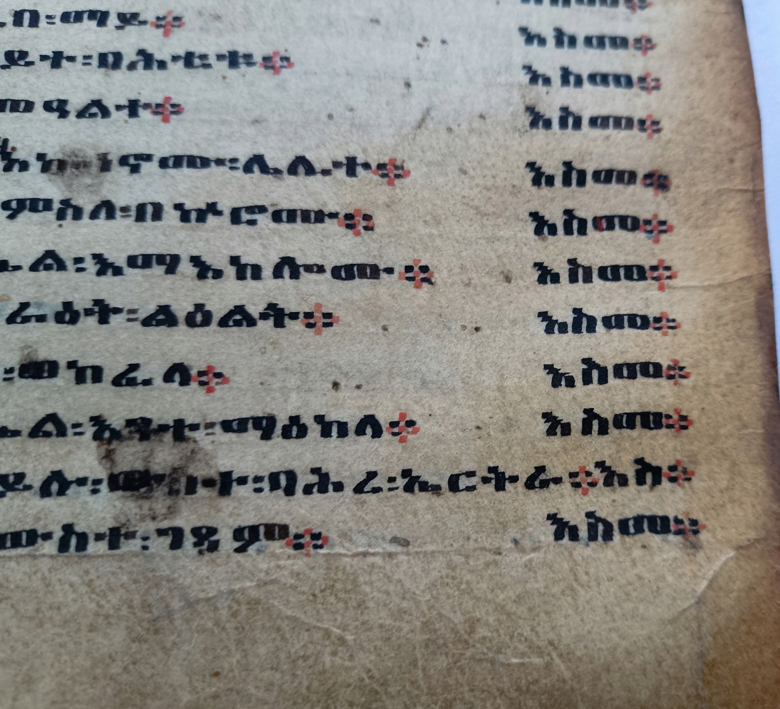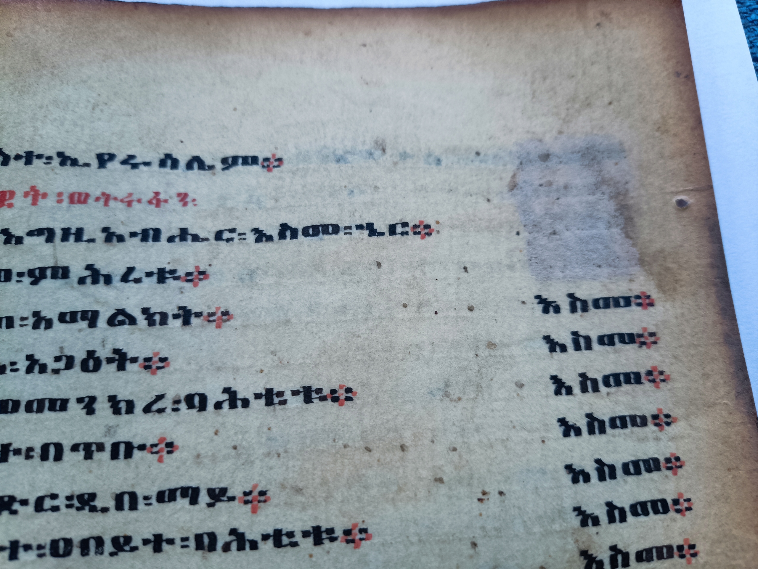 Как и во всех рукописях Geez, молитвы/тексты написаны черными чернилами, а имена святой Троицы, святых или святых семей и заголовков написаны красными чернилами. Черные - черные и красные, которые были зарегистрированы эфиопскими текстами, иногда ритуально обогащались соками конкретных магических растений или жертвенной крови, чтобы повысить их эффективность.