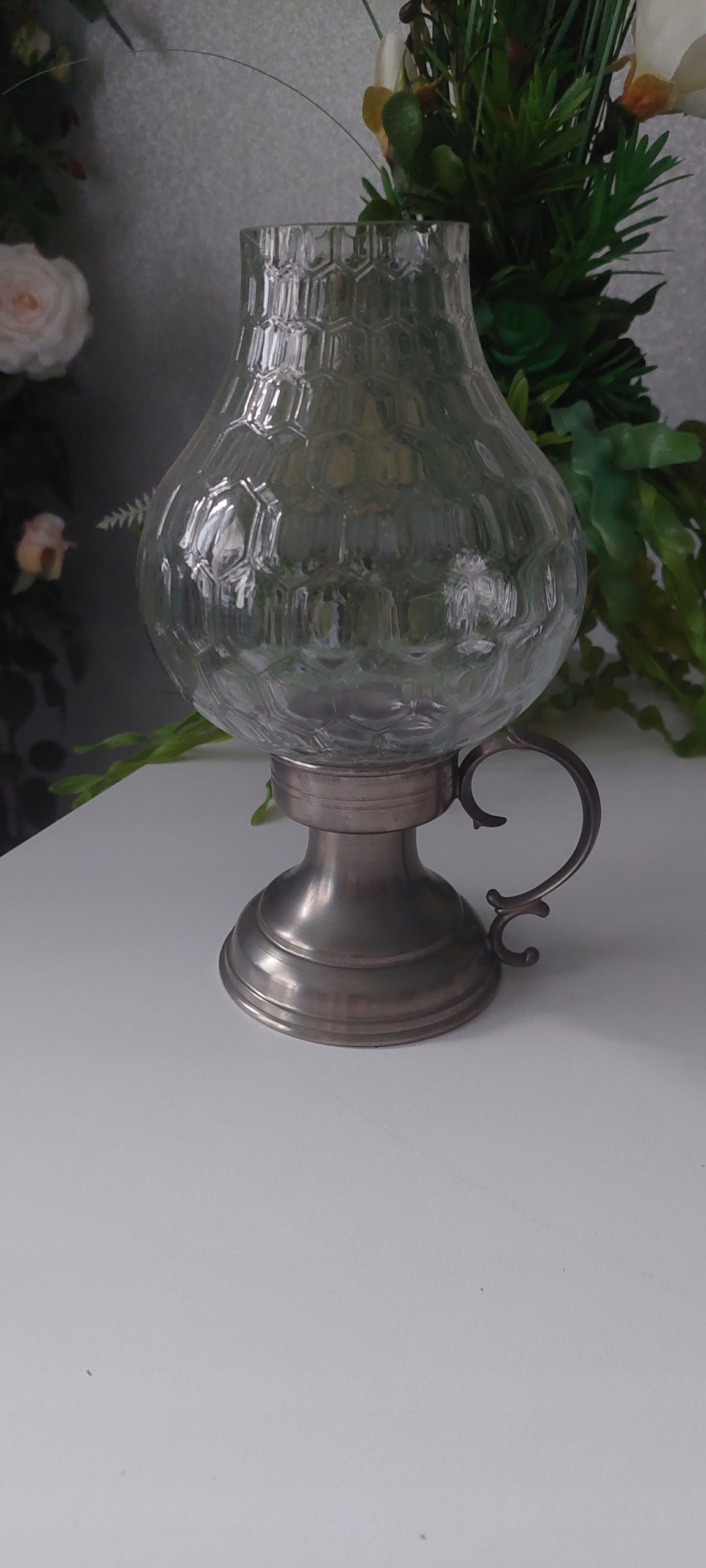 оловянный подсвечник с размерами высотой 23 см, диаметром абажура в брюшной полости 13 см, диаметр абажура на самых лучших 6 см.