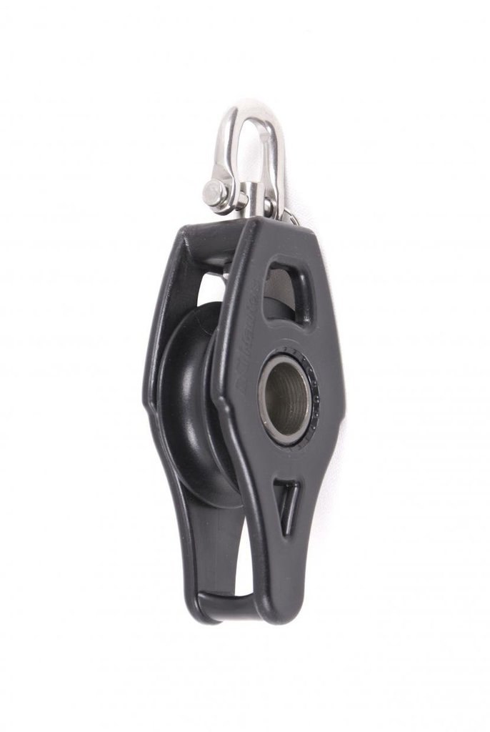 Одиночный шкив на шарикоподшипниках 40 мм с поворотным механизмом и скобой. Благодаря использованию открытой алюминиевой оси с большим отверстием шкив значительно легче стального. Прочный однородный композитный корпус устойчив к ударам и порезам, а нейлоновый ролик имеет форму, обеспечивающую оптимальное позиционирование каната.