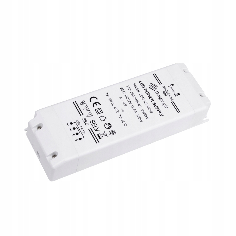 Источник питания светодиодов STANDARD PLUS мощностью 150 Вт питается от переменного напряжения 200–240 В переменного тока ~ 50 Гц. Он снижает выходное напряжение до 12В постоянного тока.