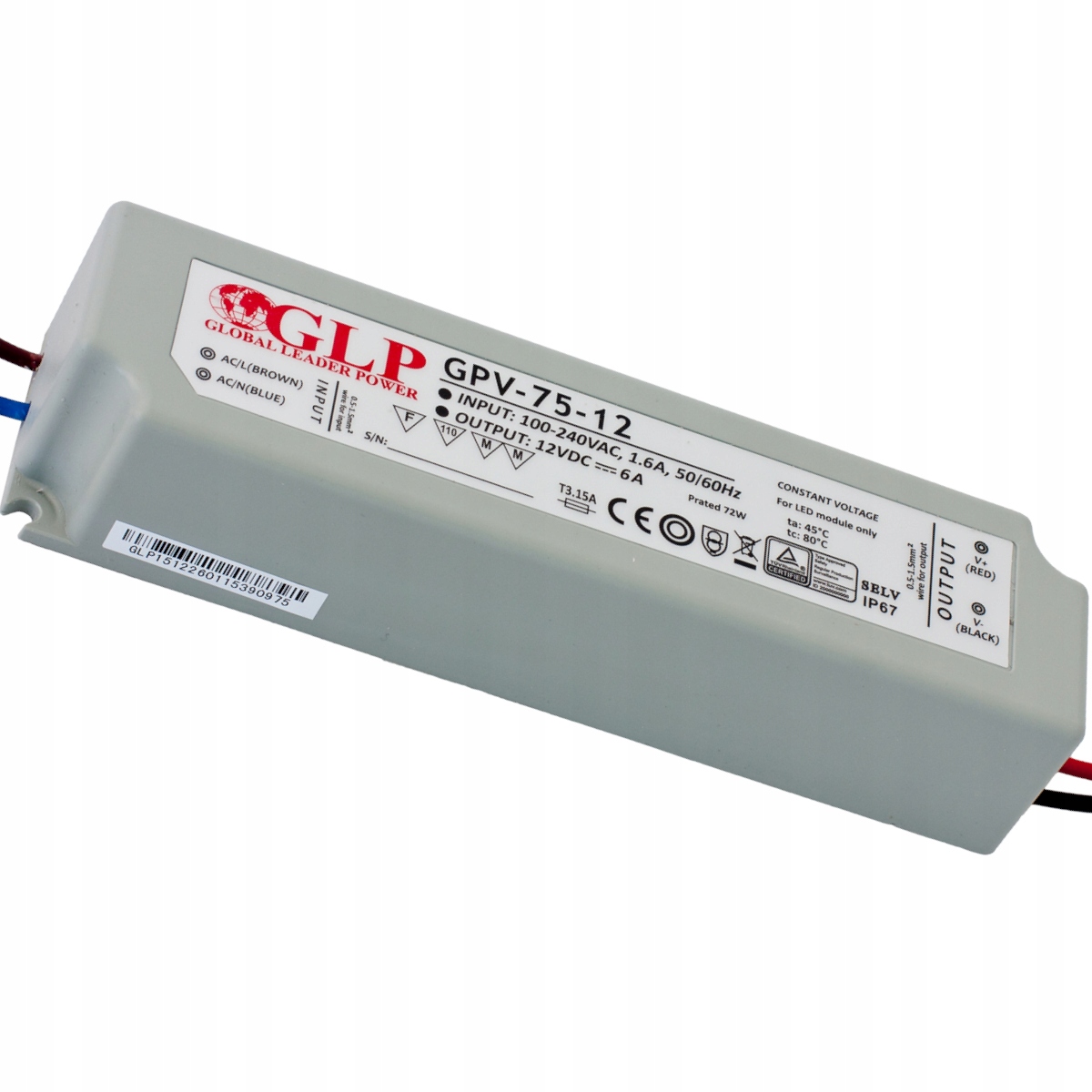 Водонепроницаемый импульсный источник питания постоянного напряжения IP67 GPV-75-12 от GLP, крупнейшей польской компании MPL, с параметрами: