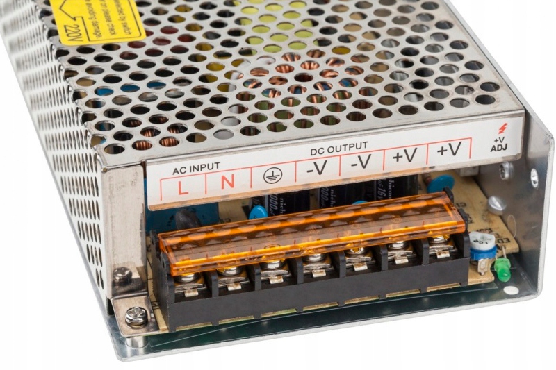 Благодаря клеммной колодке мы можем легко соединить провода, не используя специальные разъемы и не припаивая соответствующие вилки. Еще одним преимуществом этого источника питания являются дополнительные клеммные выходы, благодаря которым мы можем подключить несколько независимых цепей, например. один выход для подключения светодиодной ленты, а другой для питания мебельных зажимов.