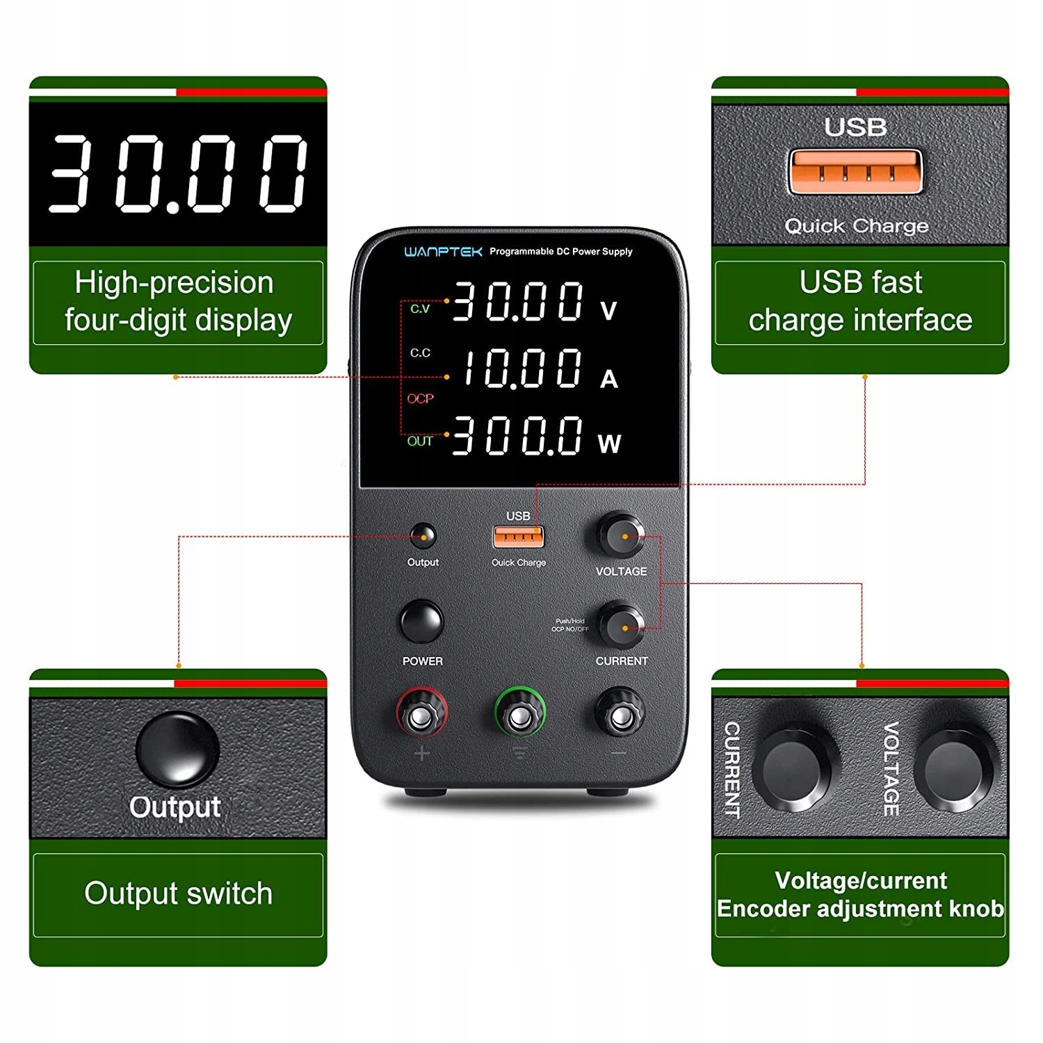 Питание постоянного тока Блок питания имеет управляемый энкодер. Каждую цифру можно выбрать, а затем установить от 0 до 9. Нажмите ручку, а затем поверните ее, чтобы точно установить каждую цифру.