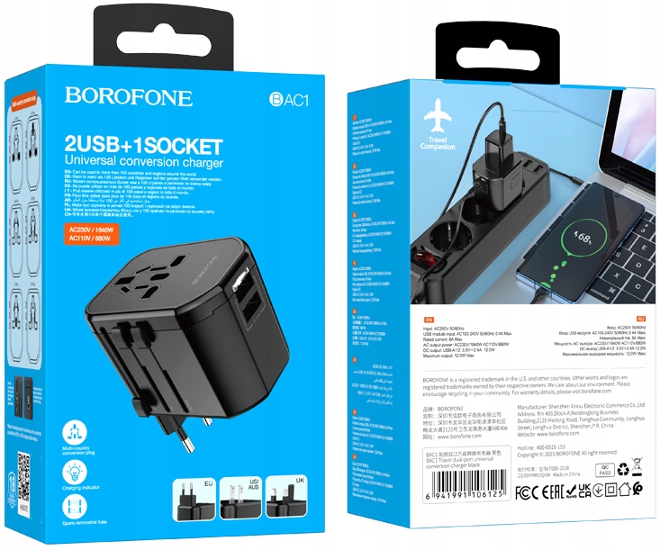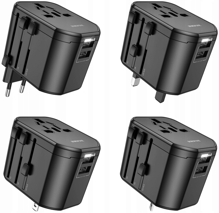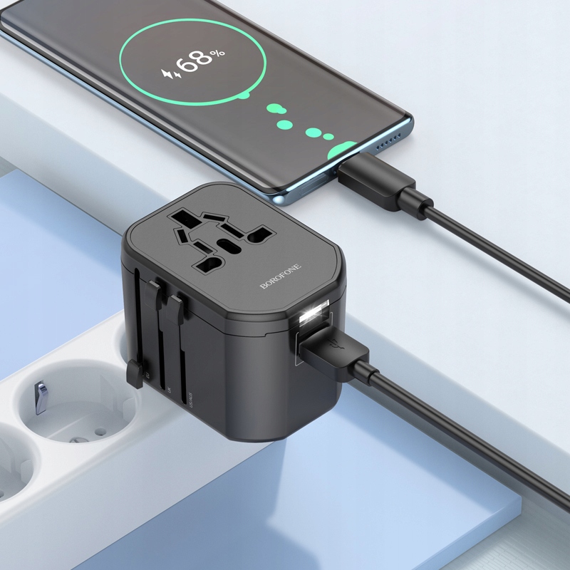 Borofone BAC1 – уникальное устройство, обеспечивающее комфорт в путешествии с электронным оборудованием. Компактная форма вмещает 4 высококачественных адаптера и подходит к электрическим розеткам практически во всем мире. В зависимости от того, где вы сейчас находитесь, вы можете использовать выбранную функцию адаптера (США, Великобритания, ЕС, Австралия) для очень простого подключения устройства к электросети. Устройство оснащено двумя портами USB (2,4А). Дополнительно встроенный модуль защиты от перенапряжения защищает от резкого повышения напряжения в электрической сети.