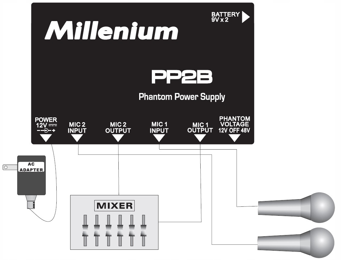 Подключение до двух микрофонов, требующих фантомного питания для работы от входов MIC 1 и MIC 2 Выберите подходящее напряжение 12 В или 48 В для подключенных микрофонов с помощью переключателя «Фантомное напряжение». Используйте прилагаемый адаптер переменного тока для питания устройства или вставьте 2 батарейки по 9 В в батарейный отсек для питания. Подключите устройство, которое будет обрабатывать сигналы микрофона, к выходам MIC 1 и MIC 2. Поскольку устройство не содержит предусилителей, усиление сигнала отсутствует.