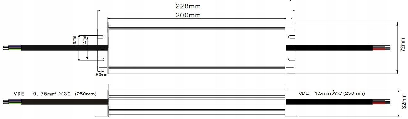 Блок питания завершен проводами с обеих сторон (технический чертеж ниже).
