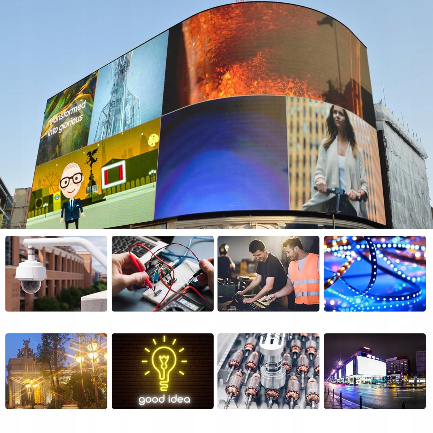 Компьютеры, рекламные щиты, мониторы, телевизоры, проекторы, ремни.