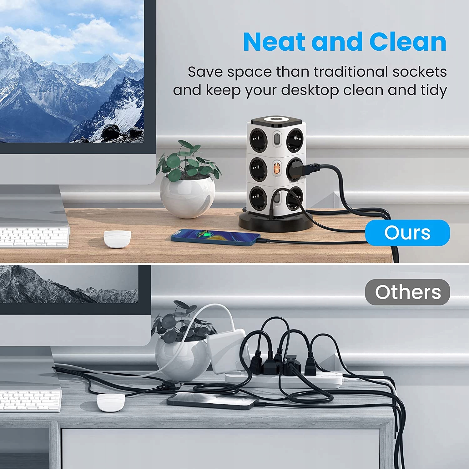 12 розеток + 3 USB: 12 розеток + 3 порта USB (всего 5 В/2,4 А) + удлинительный кабель длиной 3 метра/10 футов. Решите проблему слишком короткого кабеля, вам не придется беспокоиться о проблемах с расстоянием. Уникальный дизайн и концепция бытовой техники занимают меньше места, чем стандартные удлинители, а розетки расположены достаточно далеко друг от друга, чтобы вместить все большие вилки.